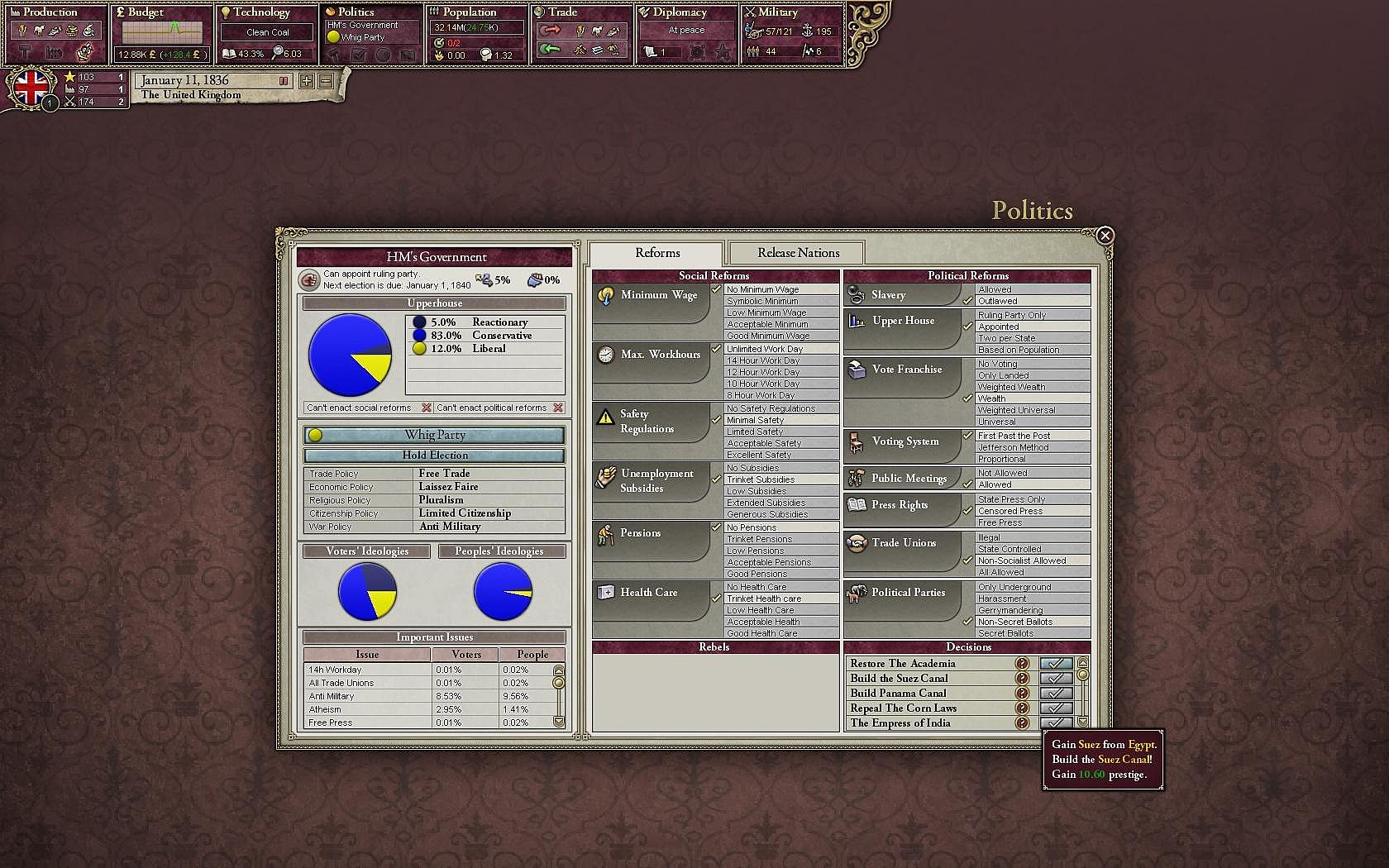 Experience an in-depth political simulation where every action you take will have various consequences all over the world. The population will react to your decisions based on their political awareness, social class, as well as their willingness to accept or revolt against their government.