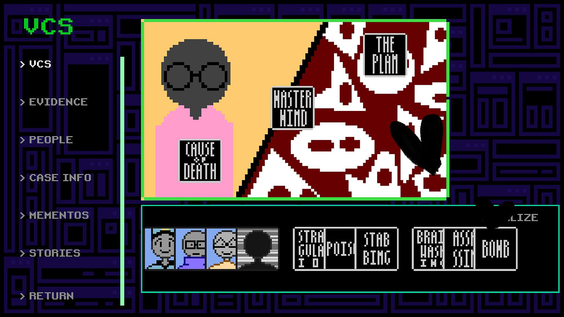 VIOLA_ is a 2D interrogation visual novel game where you play as an Interrobot, a robot sent to the Canta police station to eke out the truth from the eccentric criminals and witnesses you encounter. This world is inhabited by Cees, people with circular heads and a penchant for violence reminiscent of stick figures.