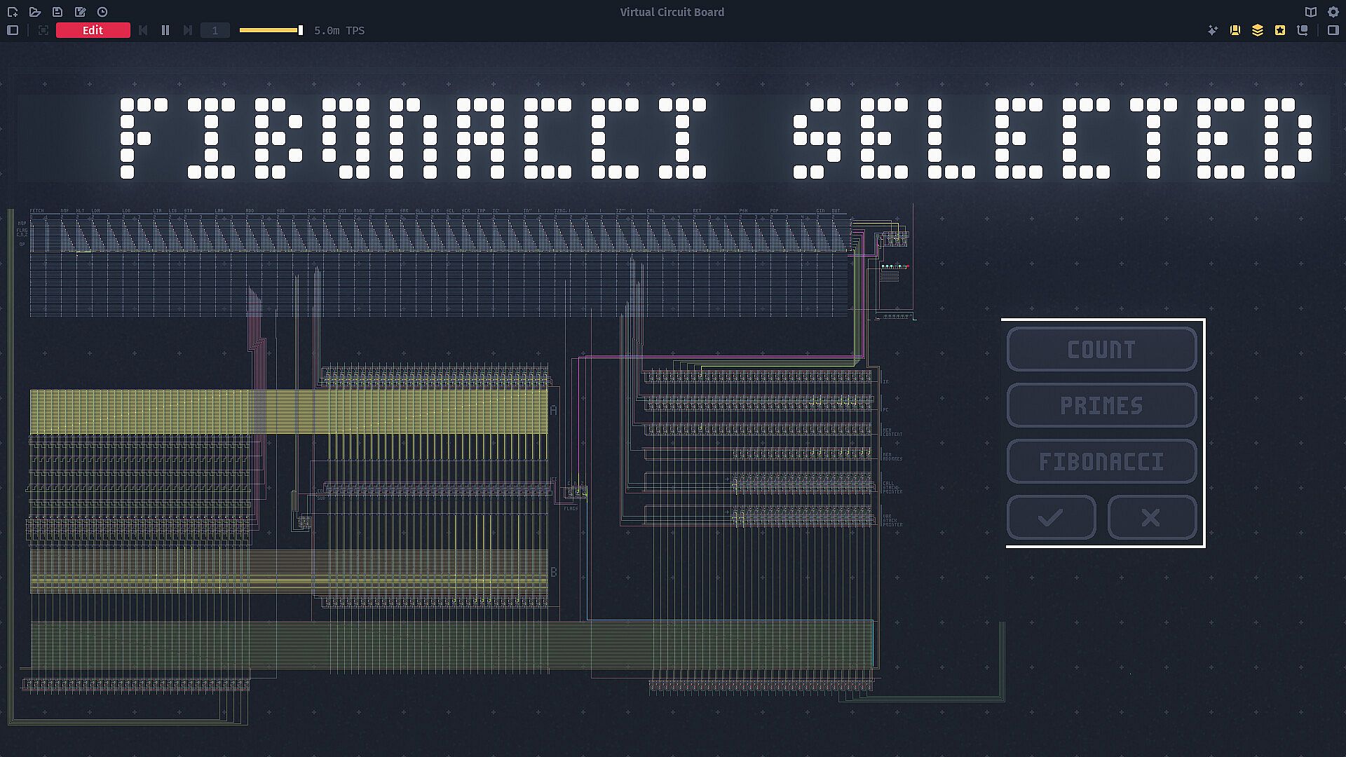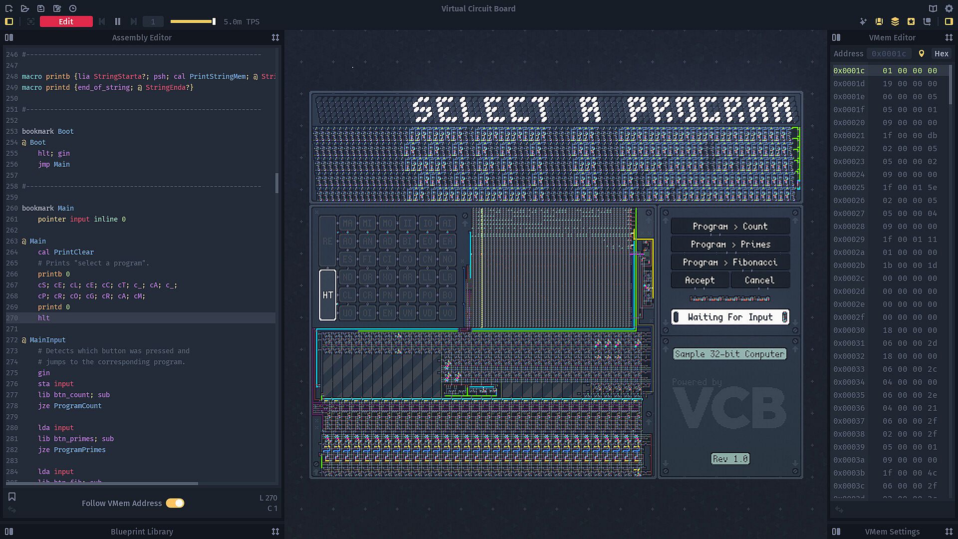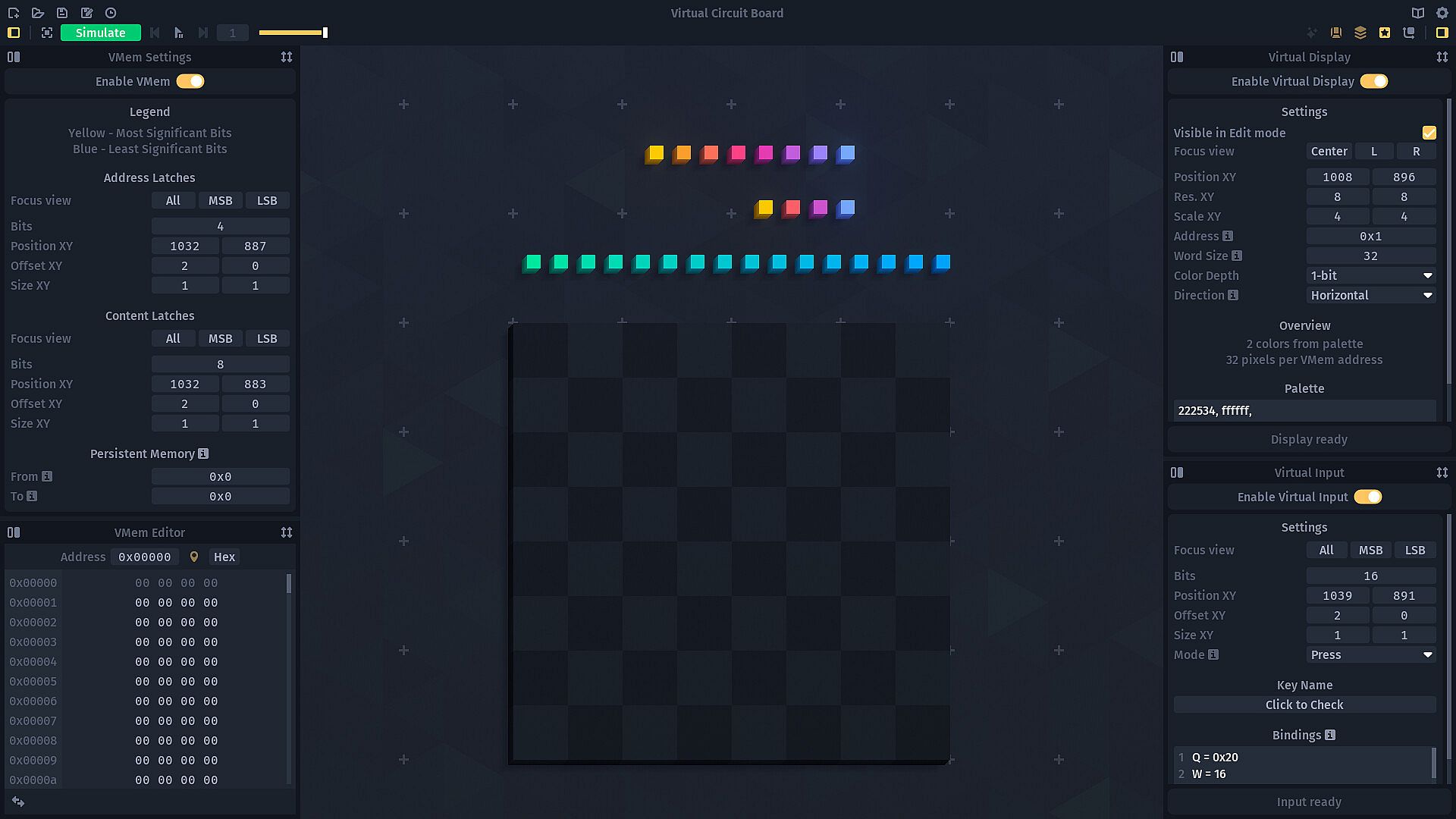 Virtual Circuit Board, or VCB, is a sandbox-only drawing-based logic simulator featuring an assembler and a powerful simulation engine. All of it designed to give you the freedom to build and experiment with logic circuits to your heart’s content.
