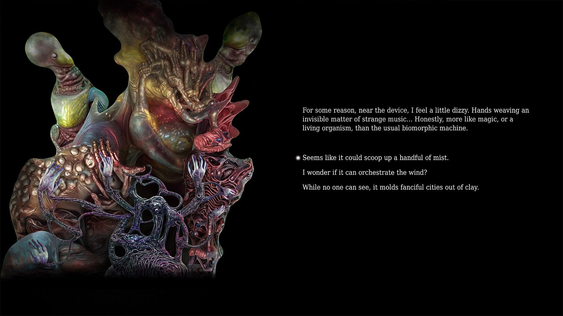 Visceratum draws inspiration from the work of those who have been able to look into the abyss of humankind. Let's honor those names: Lovecraft and Kafka, Beksiński and Giger; Cronenberg, Švankmajer, Lynch. And many other masters of the dark arts gave a bit of their energy to the seed from which Visceratum sprouted. However, the game does not try to parasitize on the greats - by paying tribute to them, it seeks to construct its own reality.