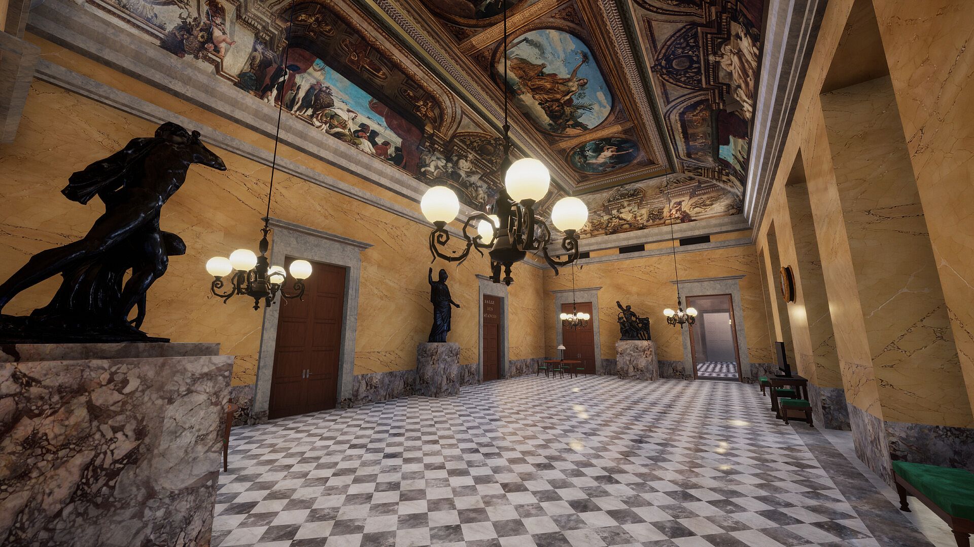 Interact with artworks, paintings, and statues to access detailed information about each piece. Follow the guided tour in the chamber, or explore freely to learn more about the symbols, institutions, and heritage of the French Republic.