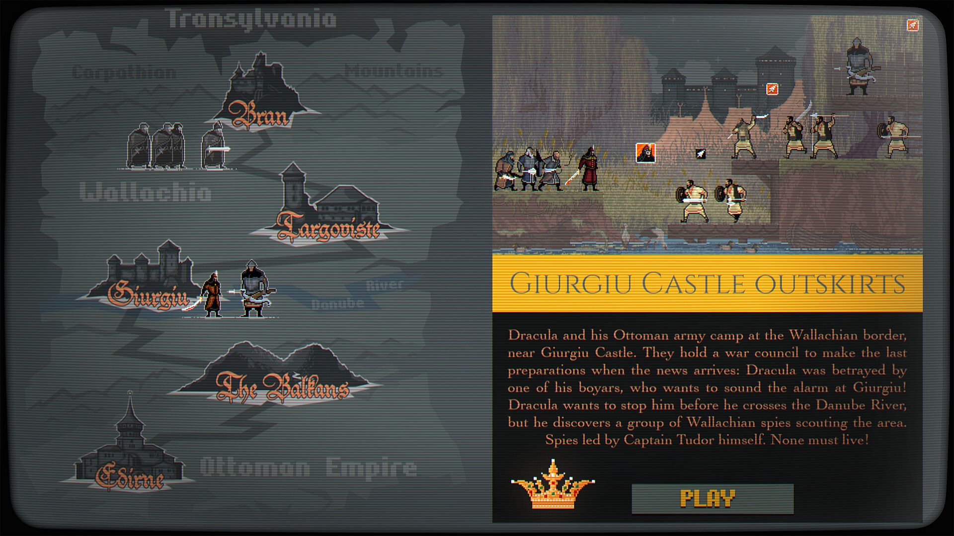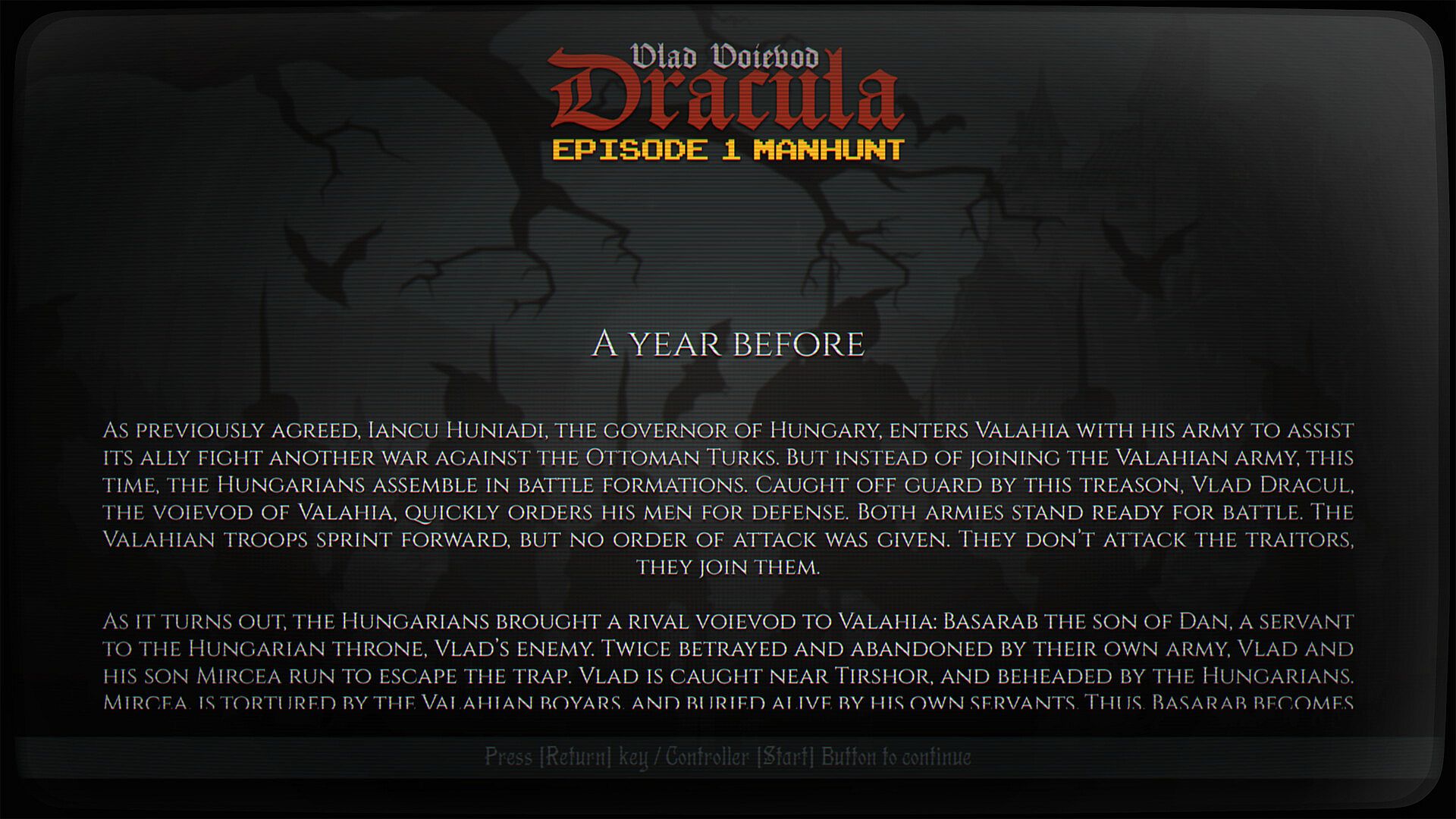This game is about the real Dracula, the medieval voievode / warlord of Valahia. It is built around key historical events: Dracula's first ascension to the throne of Valahia. Vlad Tepes is held as a political prisoner / hostage at the Ottoman Court when he learns the Hungarians invade Valahia, killed his family and offer the throne to their own servant. In response, sultan Murad sends Dracula with an Ottoman army to take his rightful throne and stop Valahia from joining another crusade. But not everyone wants Dracula to rule, he has many enemies, even in the Ottoman capital of Edirne.