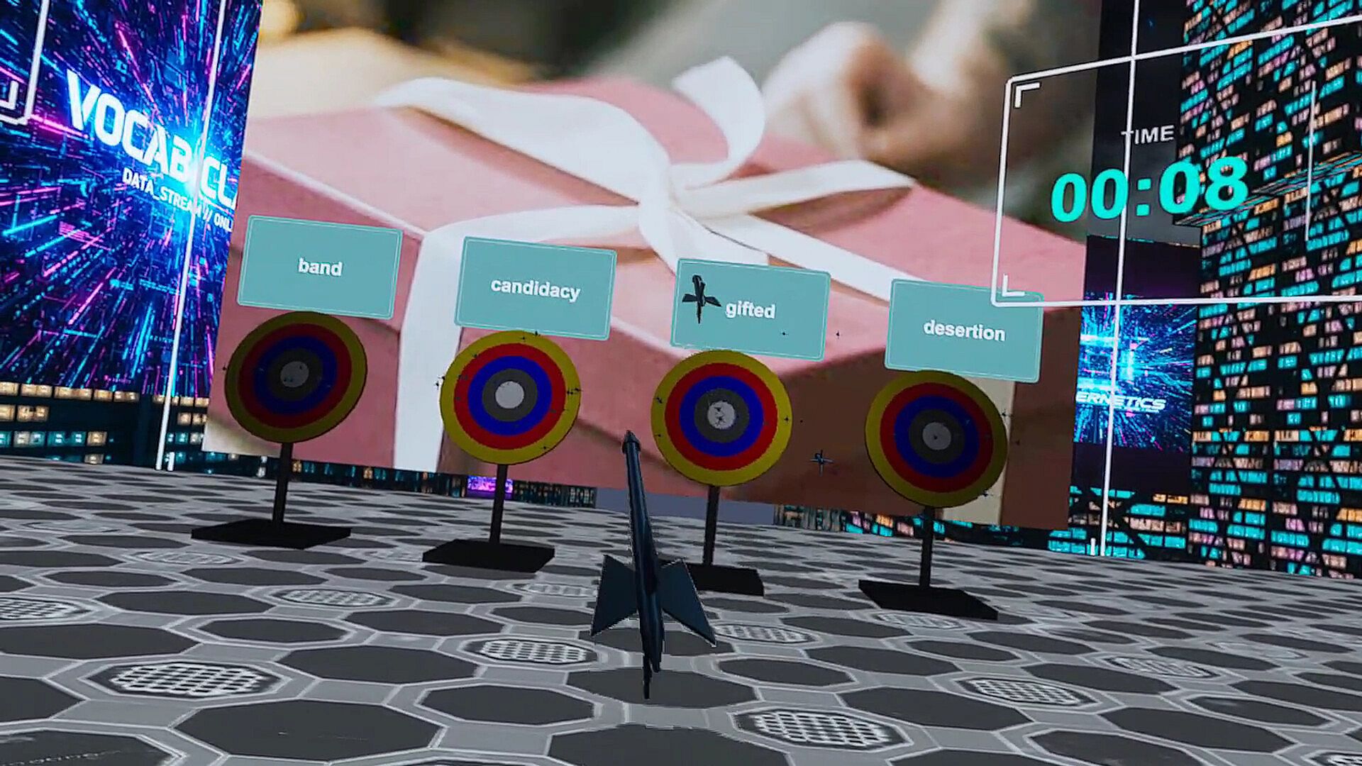 Vocab Clash is a VR vocabulary training tool based on the “guess the word from visuals” concept. The game presents word meanings through text-free images or short videos. After observing and understanding the concept, you choose the correct answer through physical actions like boxing, throwing darts, or striking a ping-pong ball—building a direct “concept–word” neural connection through immersive interaction.