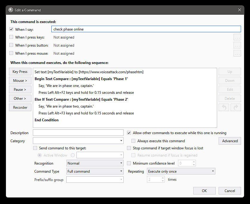 Give your responses some personality by randomizing them or by using VoiceAttack tokens (inline functions) for some extra flair. Dynamic Response Sections allow you to create extensive and immersive expressions with minimal effort. How nerdy is that?Comprehensive Macro Control