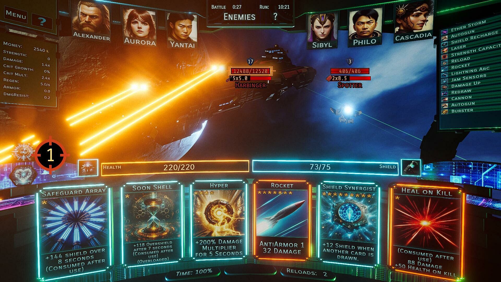 Your arsenal of weapons and battle systems is represented by a deck of cards. The cards in your hand can be played again and again, when their cooldown is finished, until they run out of ammo and need to be discarded, which reloads them. When you've discarded a card you automatically draw a new one.