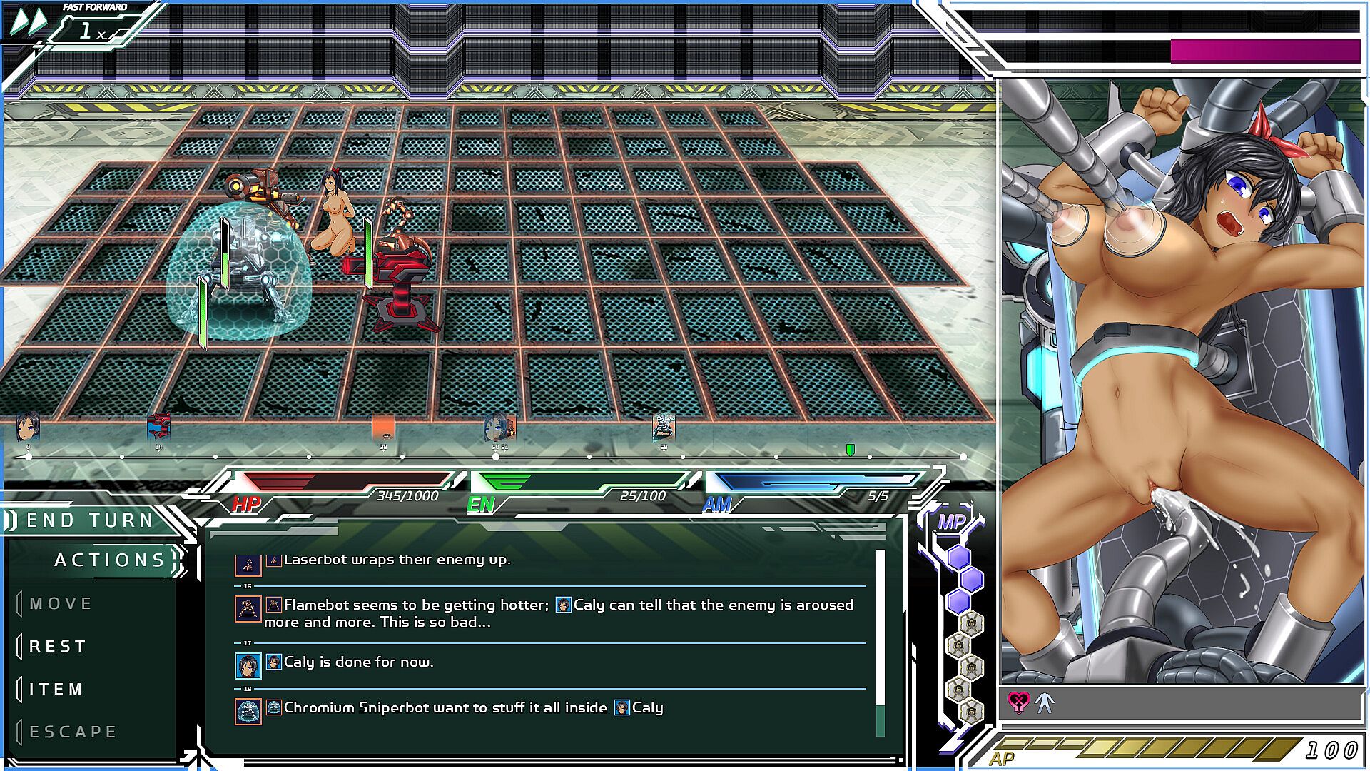 Tactical Turn-based Combat: The grid-based battlefield allows for strategic tactical movement and combat engagements. Each skill has range that defines from how far you can attack or how far you need to stay away from your foes. Be careful if your outfit gets damaged, as enemies might alter their tactics and try to seduce Caly!