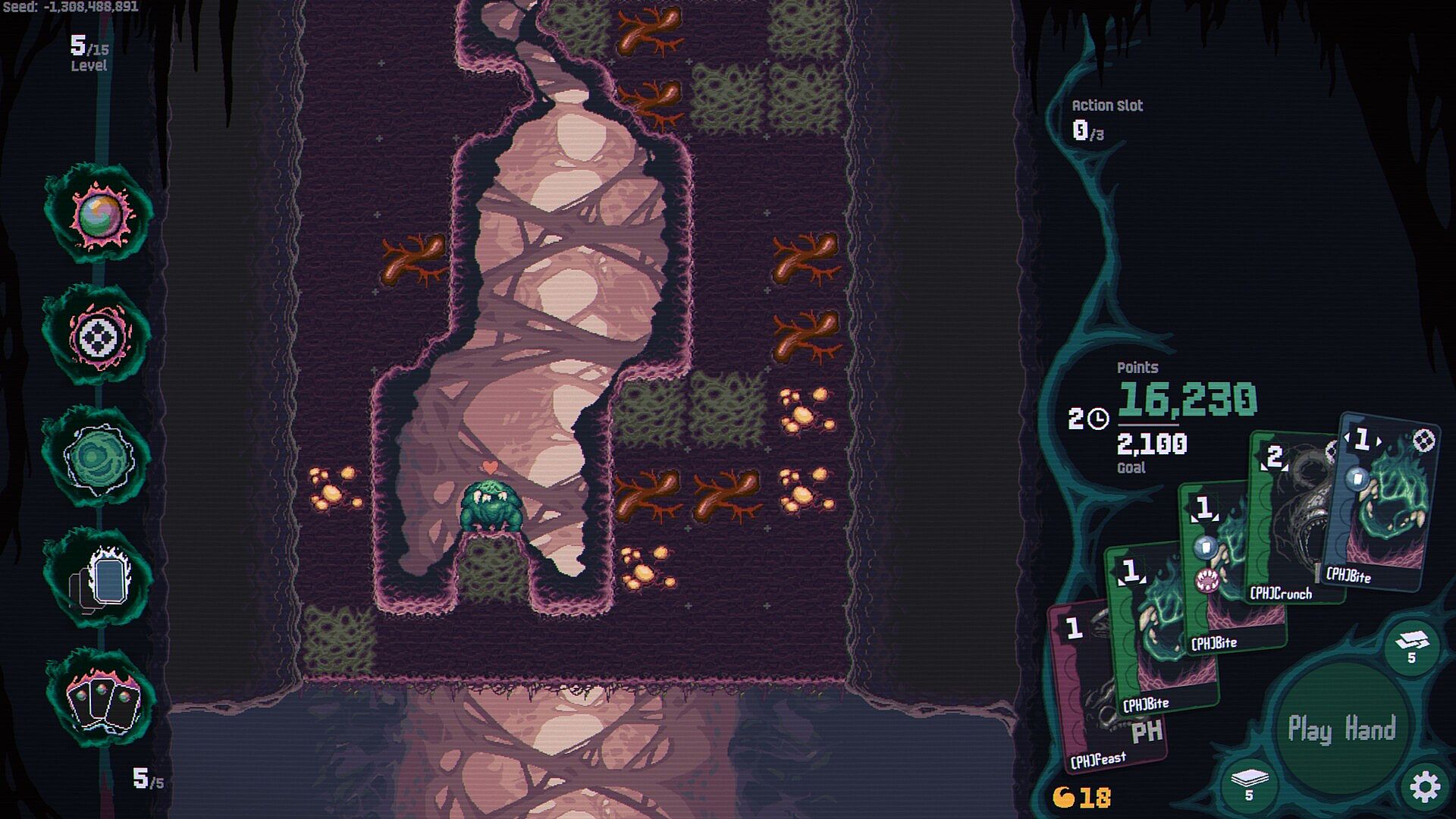 VORAXISÂ is a turn-based roguelike deckbuilder where your cards are your only way to navigate. You are a cosmic parasite tunneling through a living, breathing world, desperately harvesting its pulsing resources before it recognizes you as a threat and consumes you.