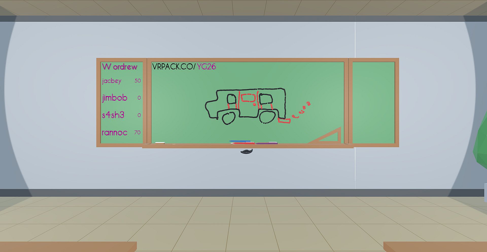 Back to school! Picking up a pen and drawing is the aim of the game here. Other players will choose words for a player in VR. The player in VR will make draw each word one after another. Players will earn more points for answering quickly and less for answering slowly. Once one person has guessed correctly, the next word is drawn.
