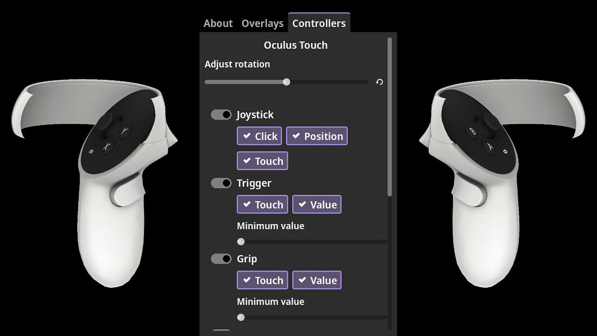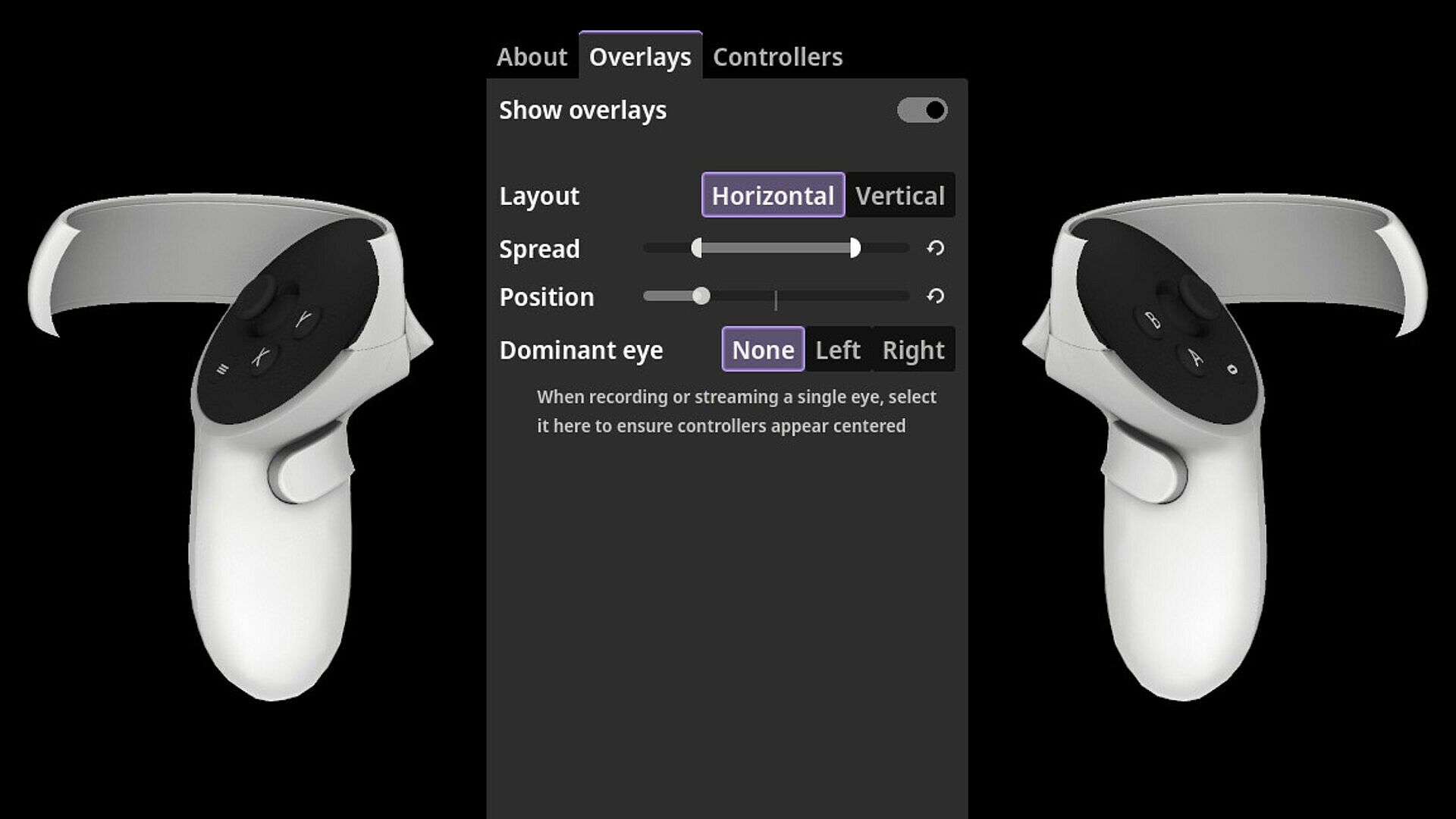 Streaming VR? Let your audience see just how hard that trigger is working. Switch off the overlays and use OBS capture to place your controllers wherever you want in your layout, with transparency support so they fit right in with no chroma-keying.
