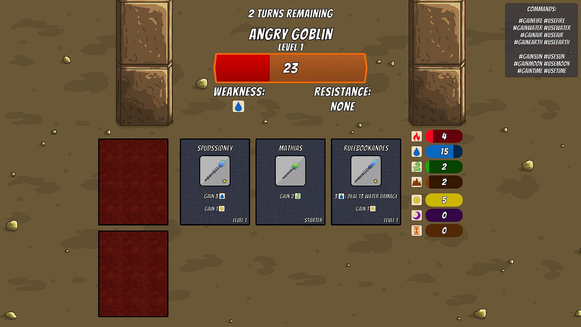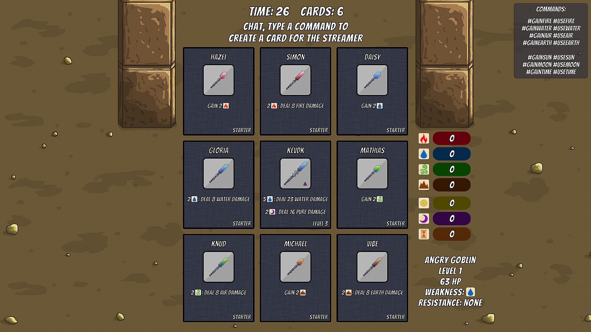 Cooperate with your viewers in this deckbuilding card game. 10 increasingly difficult opponents stand in your way, and before each encounter, your viewers will create new cards for you. Remove old cards in your deck, draft and insert new ones, and see if your deck is up to the challenge! Each card is also named after the viewer that created it. Will your viewers have your back and supply you with helpful cards, or will they sabotage you as much as they can?