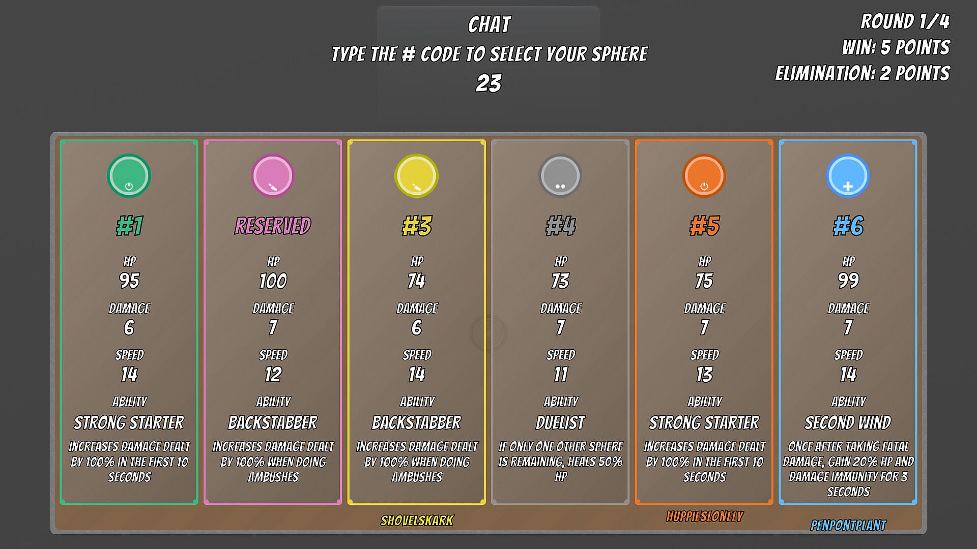 A strategy prediction game - Sphere Fighters will duke it out in an arena, but who will perform the best? Before each round, Sphere Fighters with random stats and abilities will be presented. You and each viewer will individually pick a Sphere. You get points from each elimination your chosen Sphere Fighter does, and if it's the last Sphere standing. After a certain amount of rounds, whoever has accumulated the most points wins the game! You and up to 5000 viewers can play Predicting vs Chat.