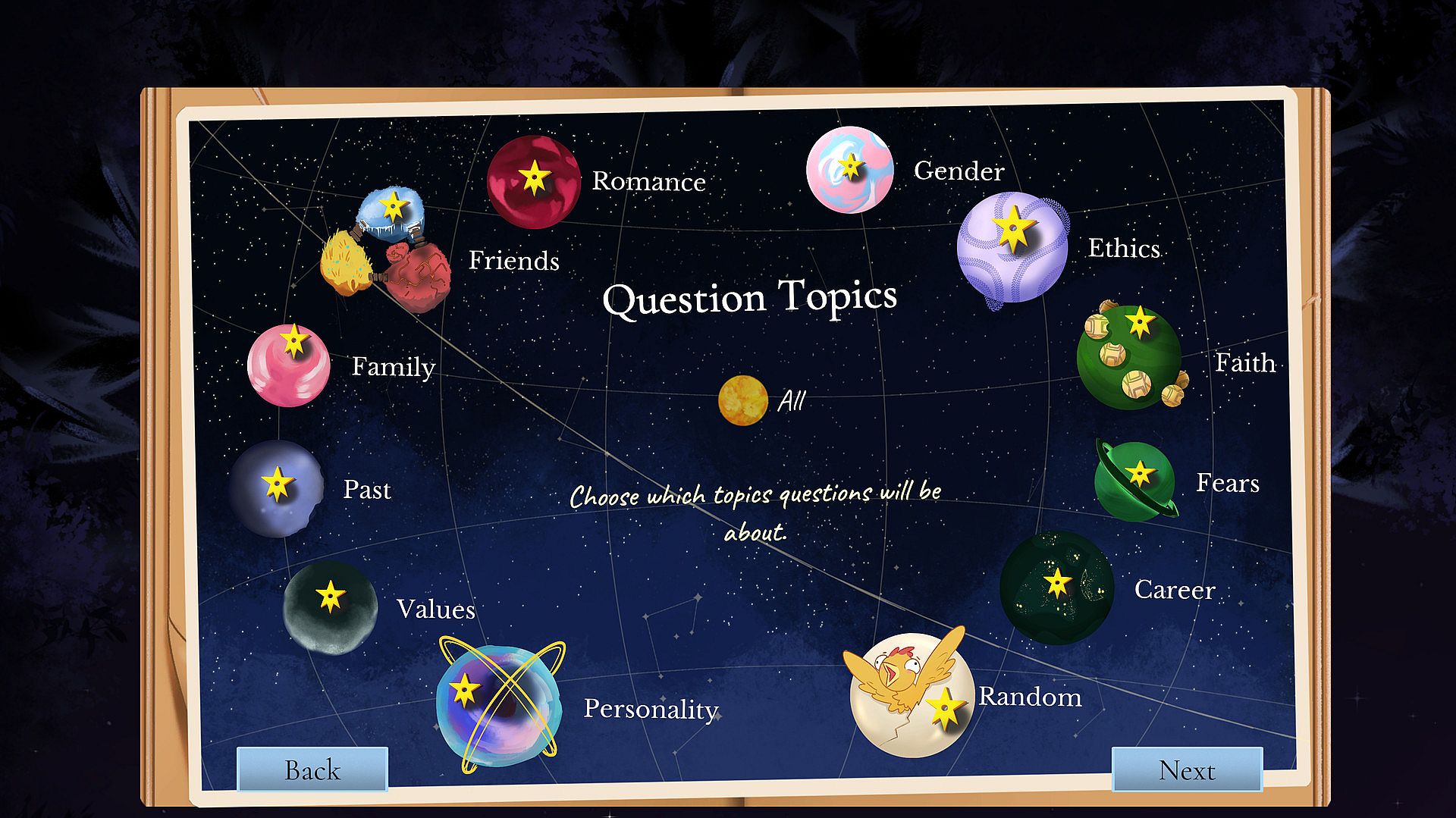 Topics: Romance, Career, Family, Faith, Past, Values, Ethics, Random, Fears, Friends, Personality, Gender.
