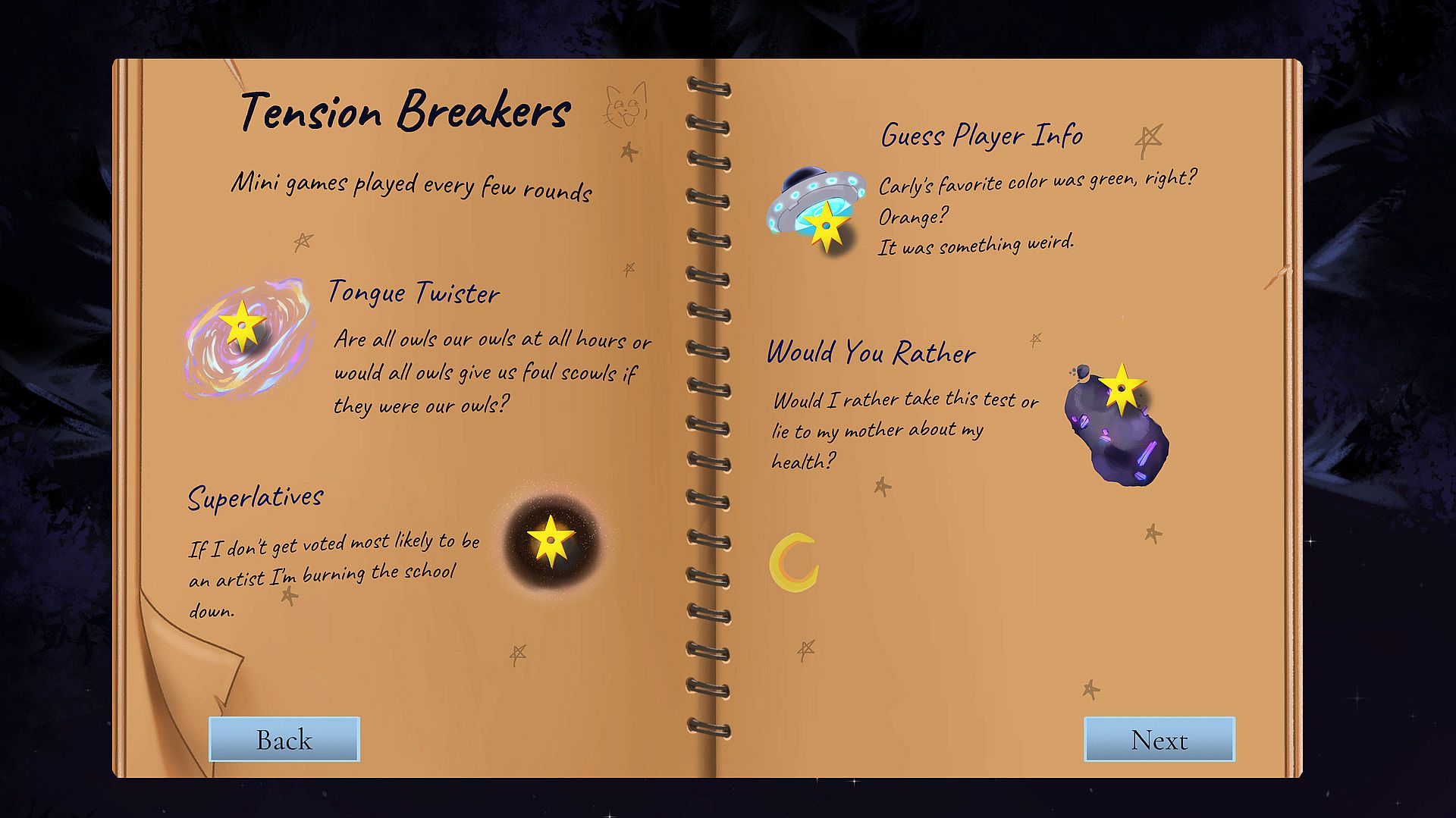 Tension Breakers: Tongue Twisters, Would You Rather, Superlatives, Guess Player Info.