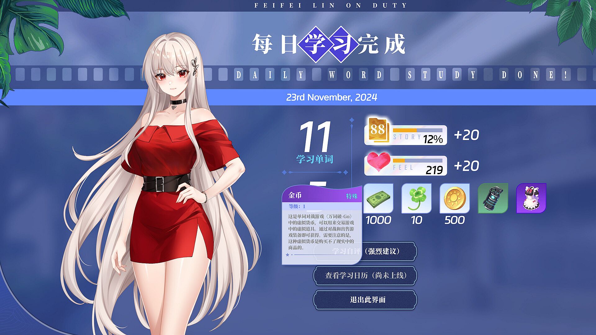You begin by choosing a vocabulary book and setting up your own study plan, including your learning methods and the number of new and review words per day. By completing these study tasks, you earn virtual currency, increase your assistants’ affection levels, and unlock new story content.