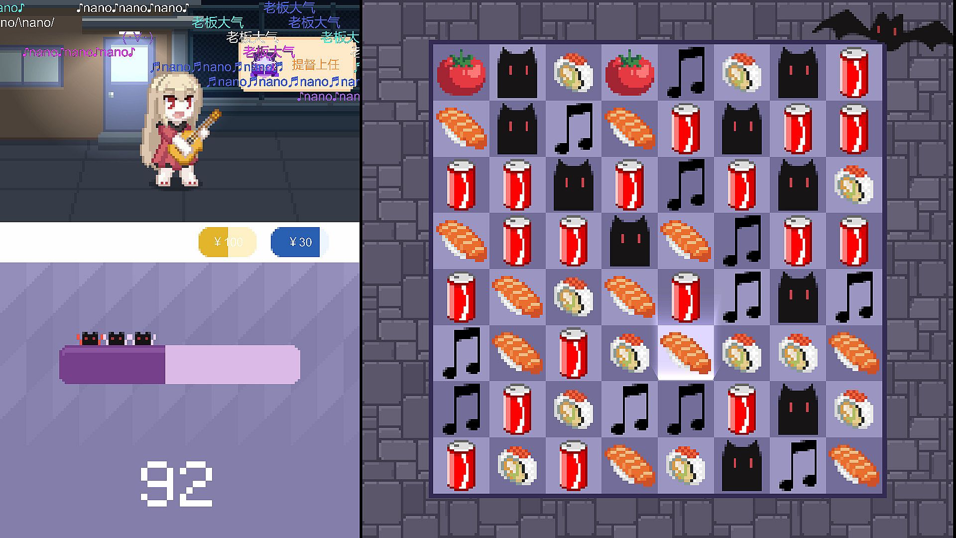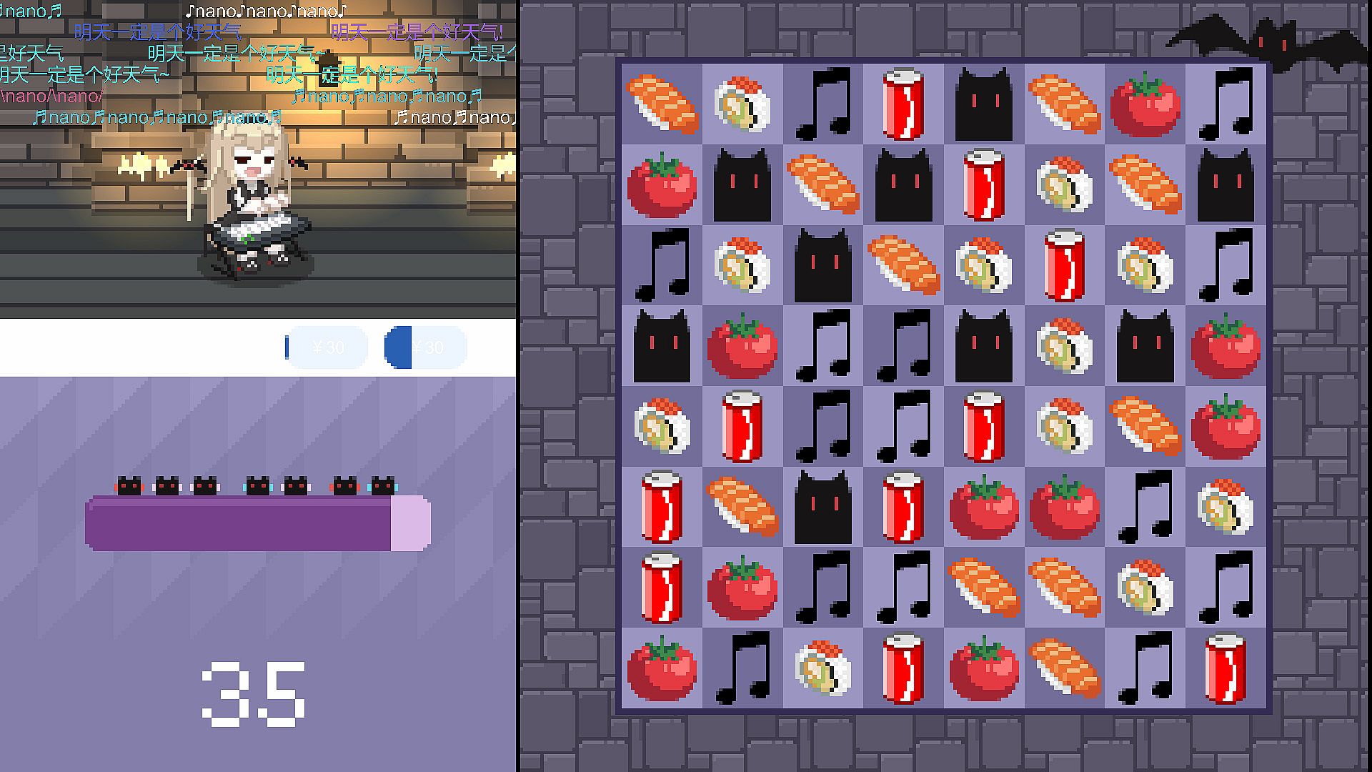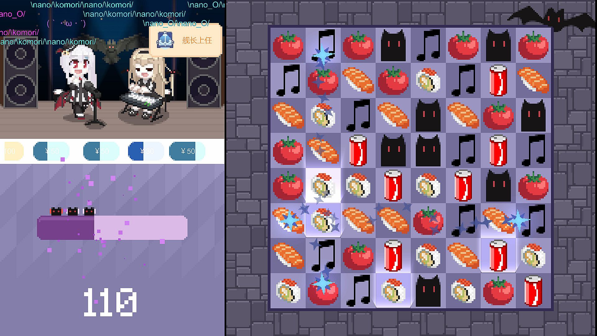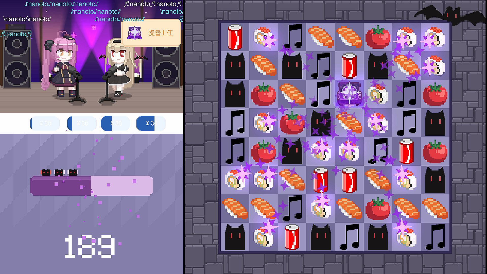 通过简单的三消游戏来帮助nano获得粉丝,大航海和音乐点。在消除发光方块后会有舰长出现,在进行5消后可以收获稀有的提督!随着大航海成员的增加,粉丝的增长速度也会提升。