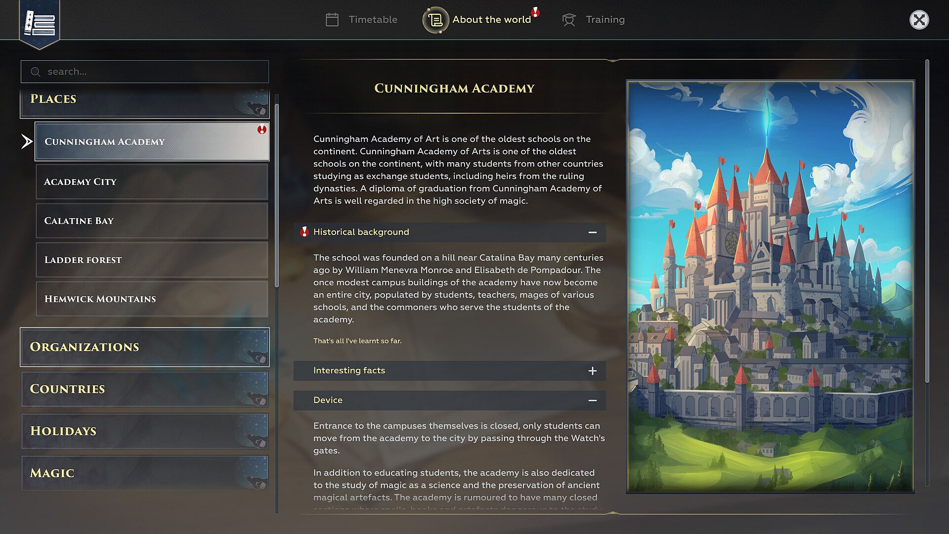This prestigious academy was founded at the beginning of the century by two great magicians, and accepts only those of noble birth. Here, our hero begins his great journey.