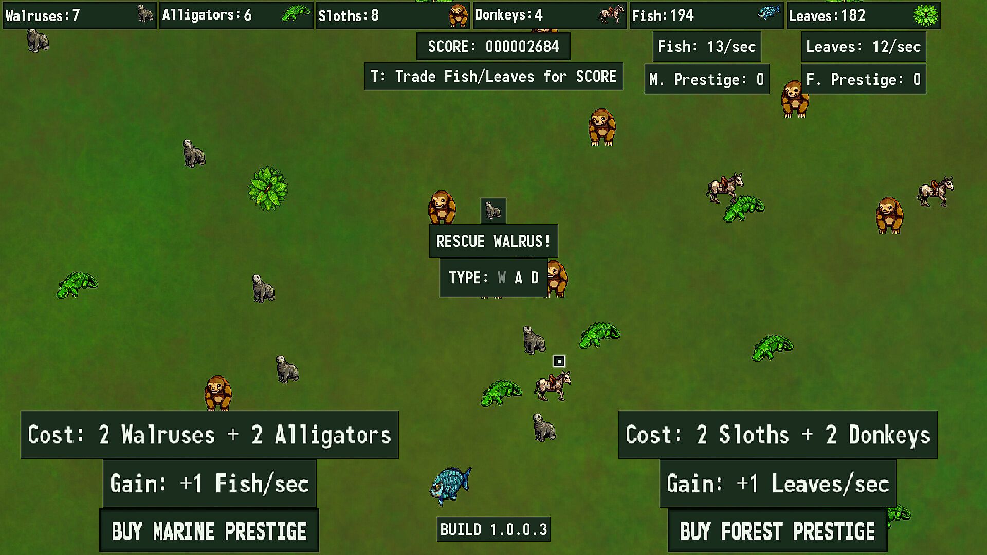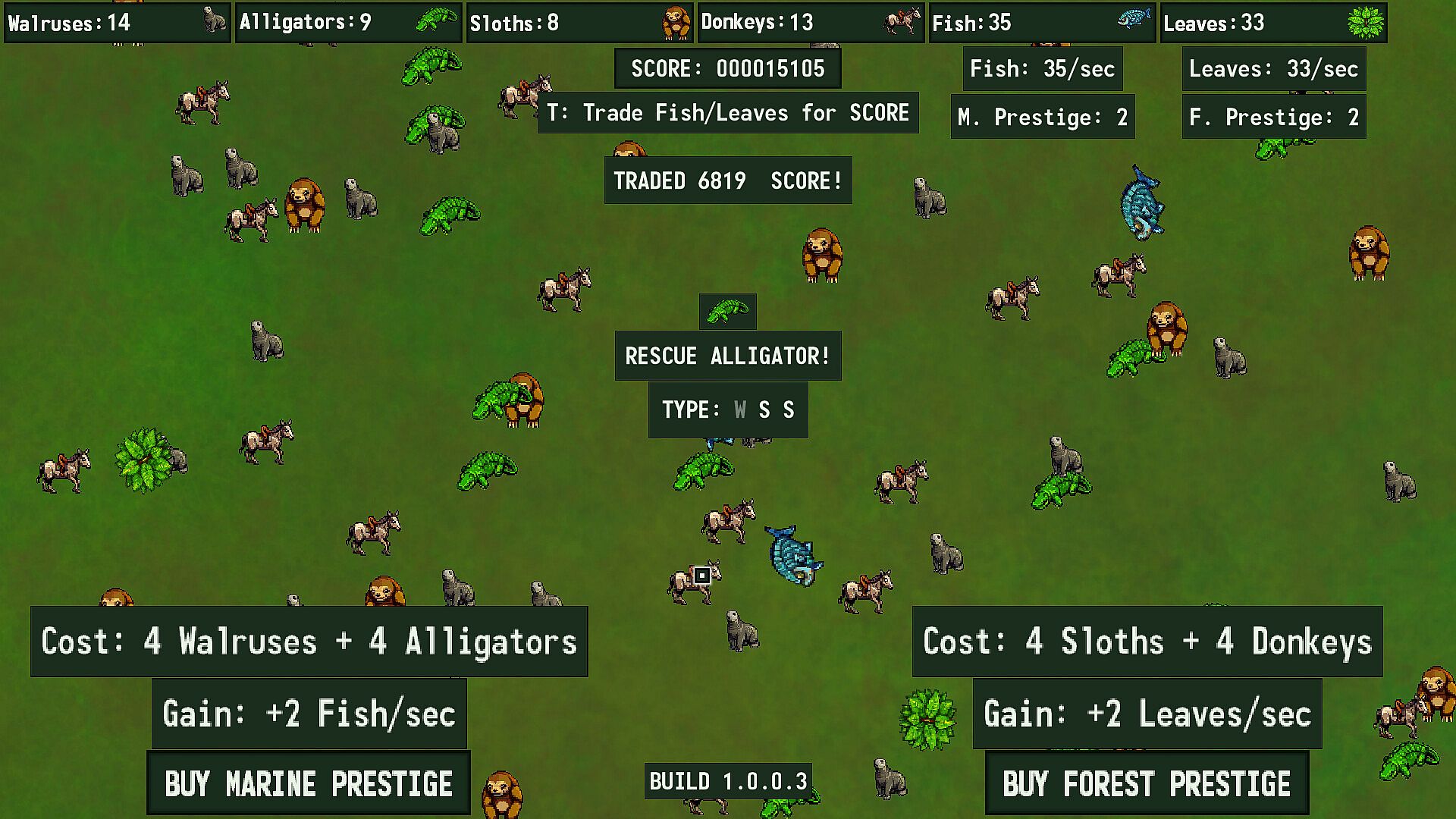 In this top-down clicker-typer with arcade bursts, you’ll rescue animals and grow habitats. Type the 3-letter prompts to complete rescues, click falling pickups for bonus Fish/Leaves, and trade resources into SCORE. Invest in upgrades to automate income and obtain Marine Prestige and Forest Prestige to further unlock achievements—then watch your sanctuary come alive.