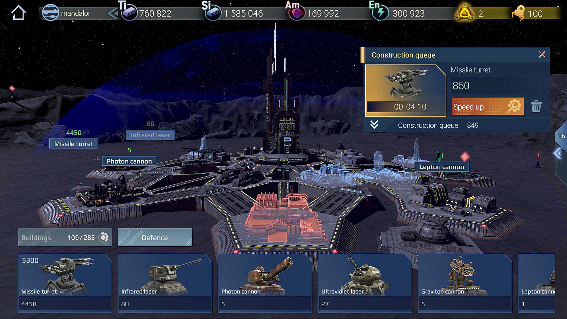 The planetary base is your fortress. The main resources for construction are extracted and stored here, scientific research is carried out, new projects for the construction of spaceships are being opened, and much more. The space fleet and ground defense will help protect the base from uninvited guests. Build energy domes, laser cannons, and upgrade technologies.