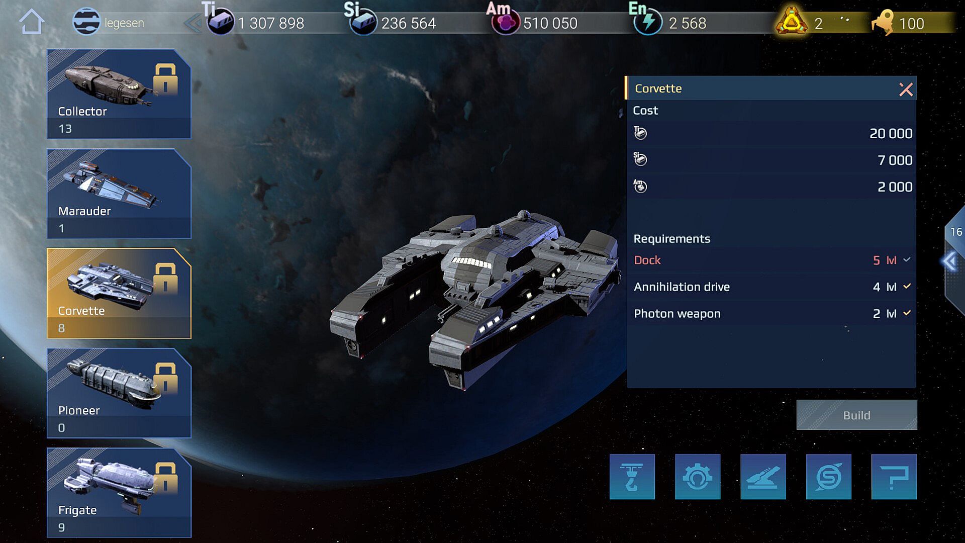 The dock is the forge of spaceships. Currently, there are 15 types of ships in the game that will be available upon completion of the game. Each ship has its own characteristics and purpose. There are warships with different levels of armor and tactical weapons, there are scout ships, transport ships, there are ships for exploring new planets, collecting debris and even stealing. The player is given the opportunity to form flotillas himself and send them on various missions.