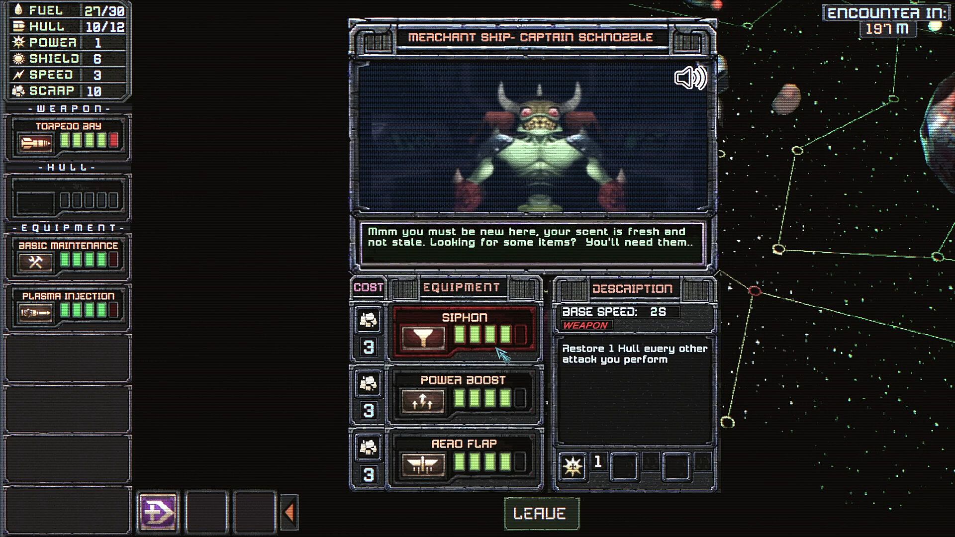 Thrust into an uncharted sector of the galaxy by an anomaly, you realize that you'll have to attempt to chart your way back home. Deal with traders to purchase parts for your ship, manage your fuel and scrap resources, defend against hostile species you'll face, and use Warp Crests to help you traverse between sectors.