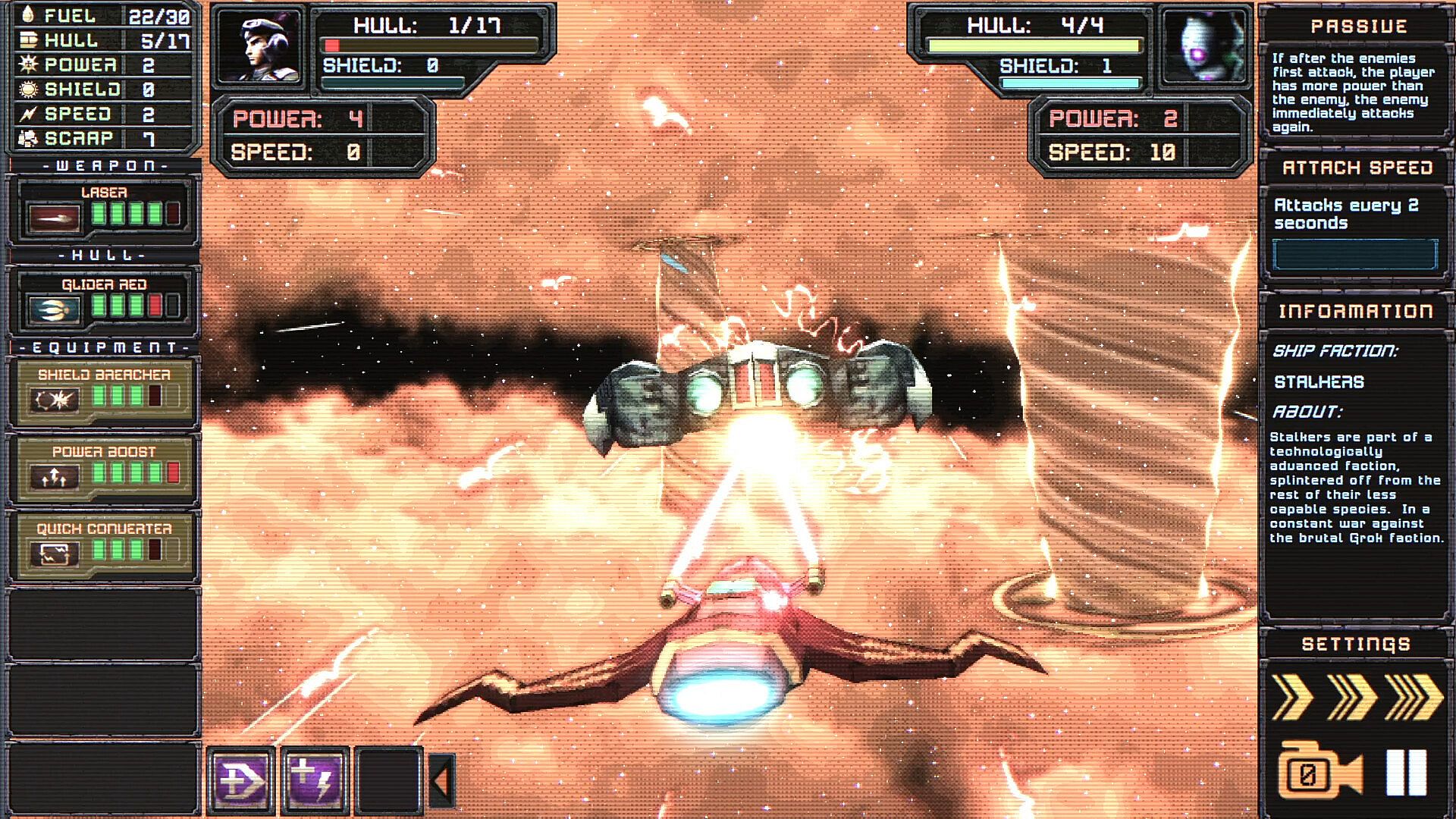 Equip your ship from a selection of hundreds of ship parts to help you survive the journey home, giving you variations of Speed, Shield, Power, and Hull, letting you combine different equipment to suit your immediate needs, and for the bigger battles ahead. Will you choose the Siphon weapon, with a fast attack speed of every 2 seconds, or the Red laser, which attacks slower, but draws extra damage from your shield? Do you have enough shield to justify that weapon? Maybe you'll buy a Shield Booster, allowing your shield to regenerate over time, but wait, the faction leader is almost here, and his weapon draws power from your own shield. With a narrow inventory space, you'll have to be aware of the synergies and faults of your ship parts, balancing them out according to the different situations you'll be facing.