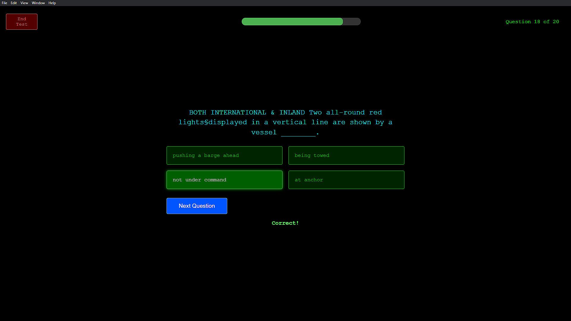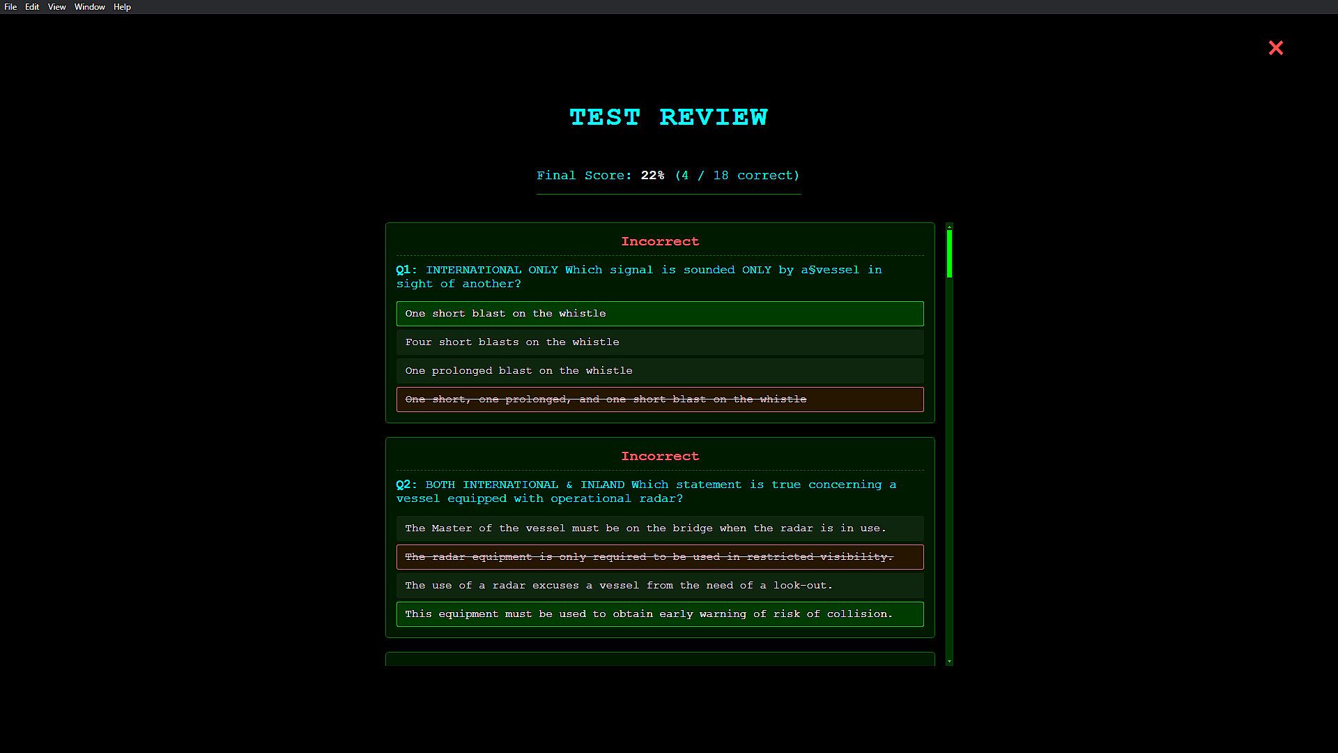 This standalone app presents randomized multiple-choice questions derived from the International Regulations for Preventing Collisions at Sea (COLREGs). Track your progress over time and build the confidence to recognize correct maneuvering decisions — under pressure.