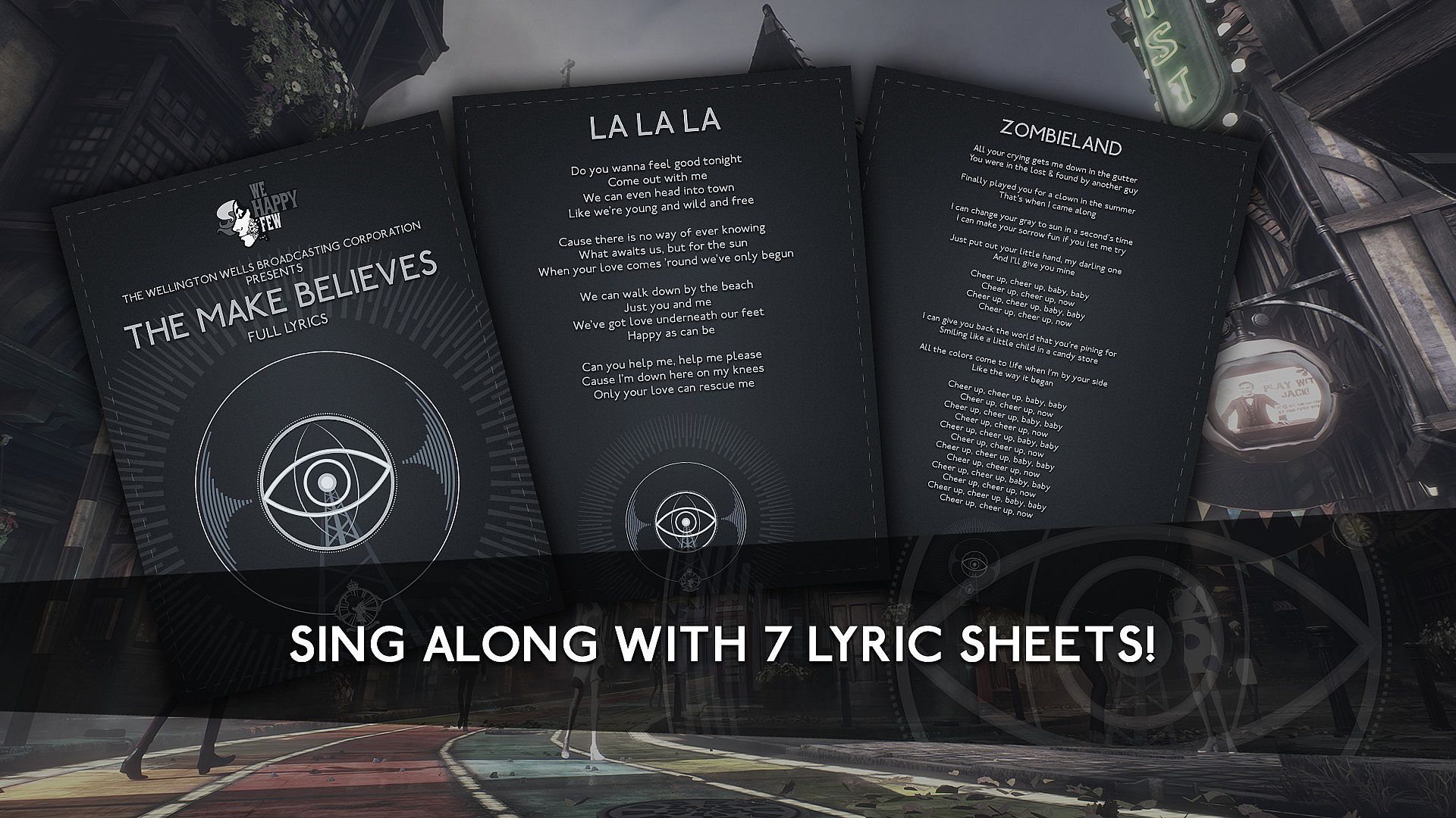 The soundtrack includes songs from the game as well as The Make Believes, a tailor-made boy band paying tribute to the swinging sounds of the ‘60s, with original tunes created just for We Happy Few. The Make Believes are: