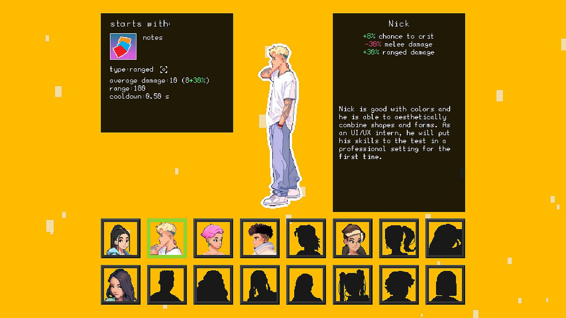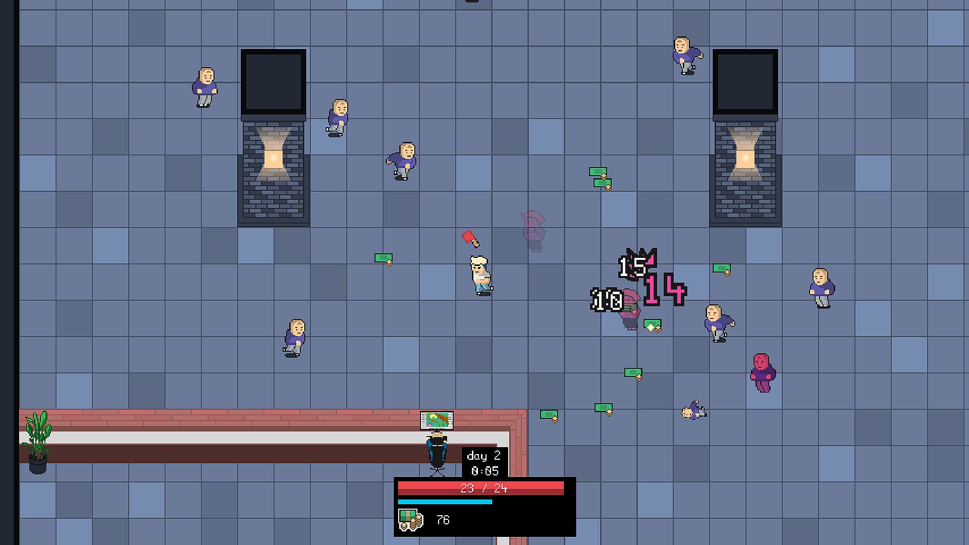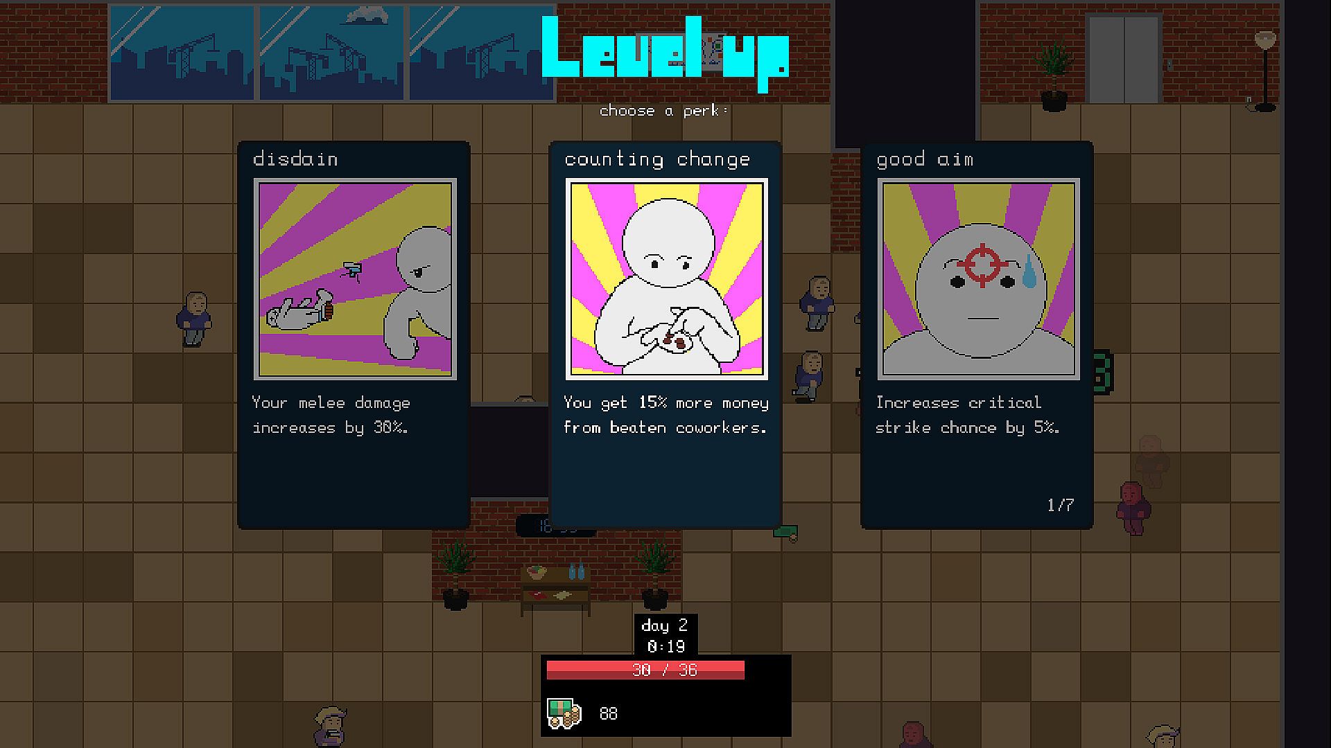You choose one of the characters which are playable right from the start and gain experience and money by defeating your coworkers. Combine character traits, items and perks.