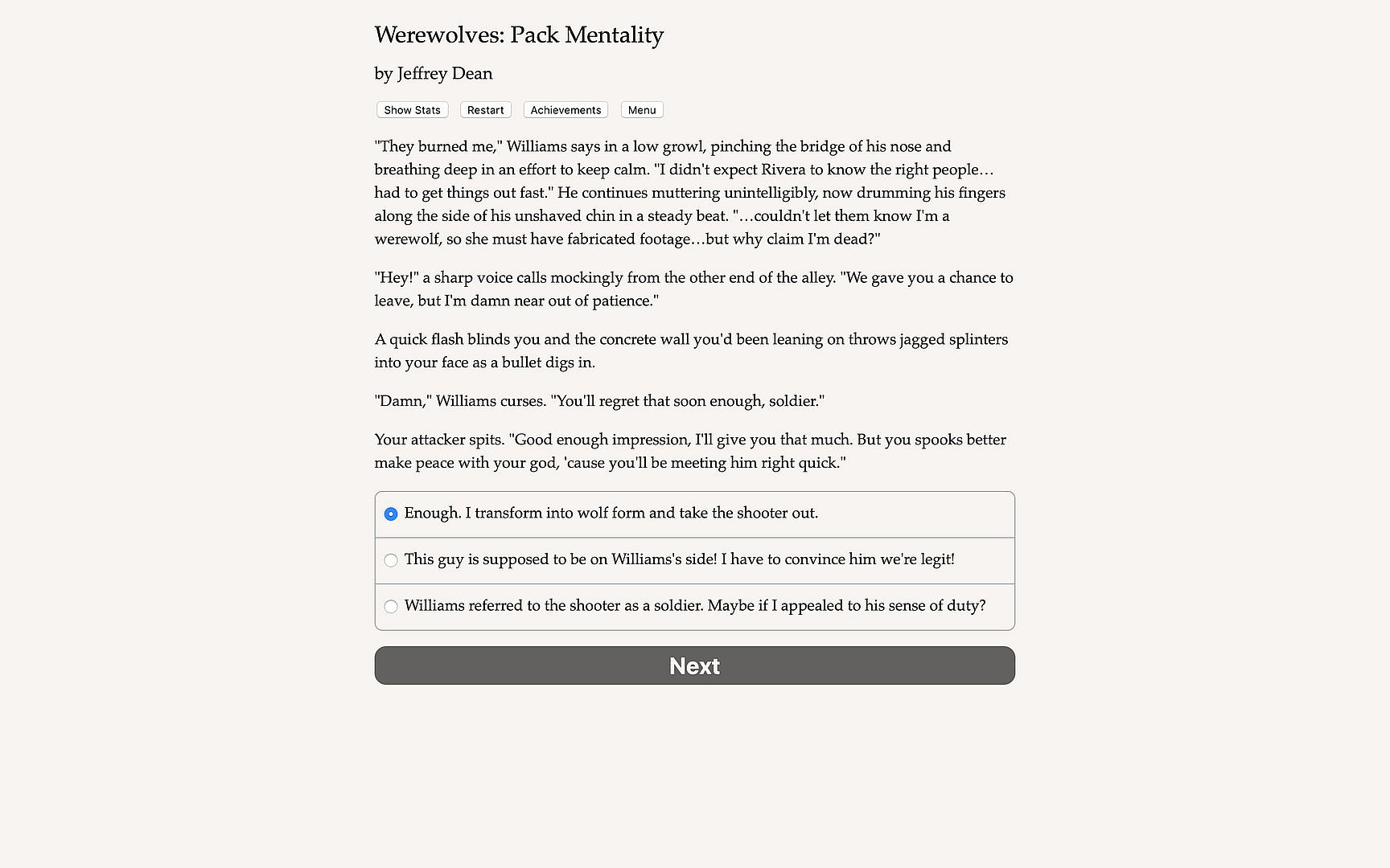 Werewolves 2: Pack Mentality is a 360,000 word interactive novel in Jeffrey Dean's acclaimed 'Claw, Shadow, and Sage' series, where your choices control the story. It's entirely text-based—without graphics or sound effects—and fueled by the vast, unstoppable power of your imagination.