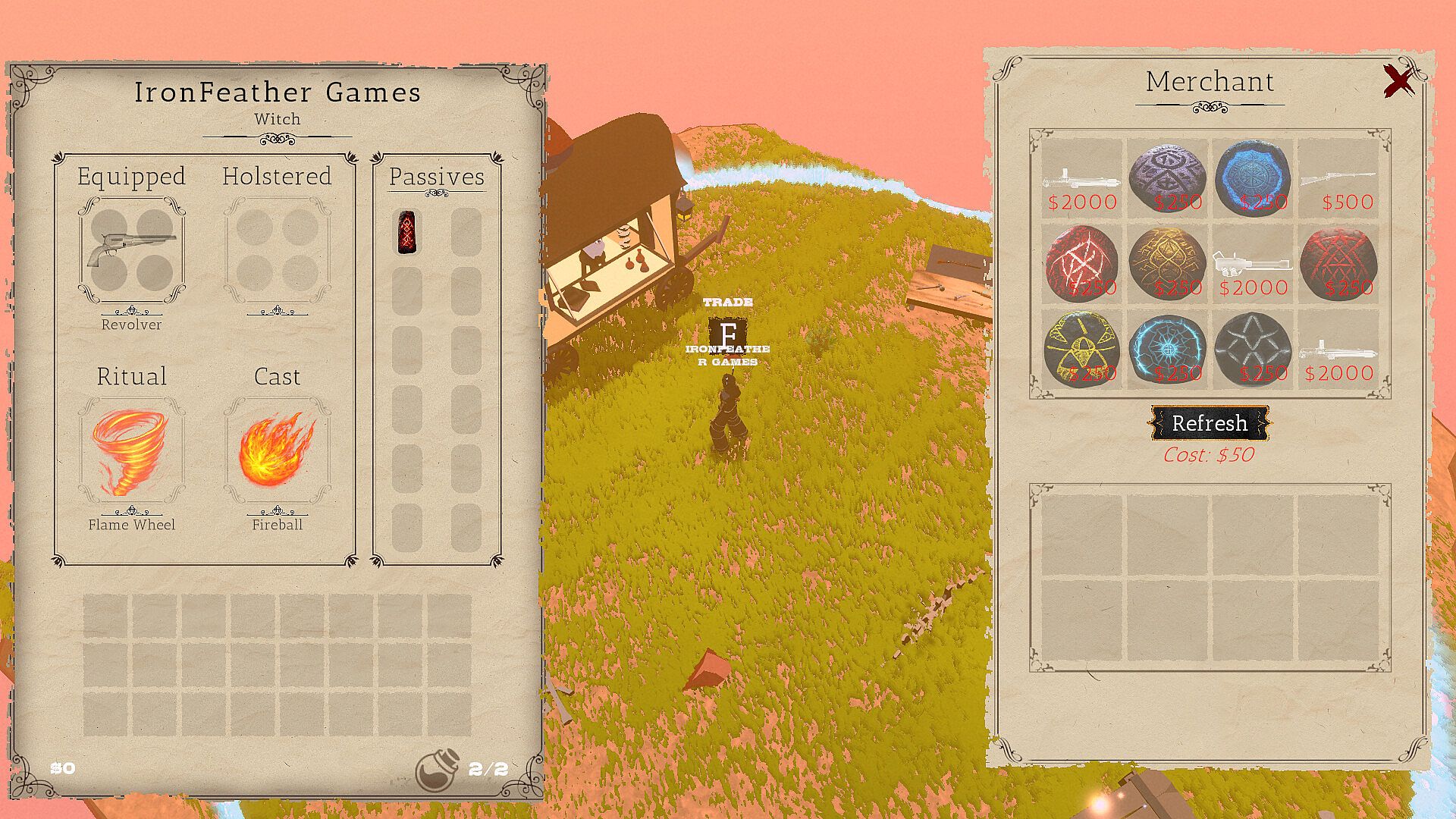 West of the Witchlands is a cooperative roguelike where players fight hordes of gnoll thralls using a variety of spells and firearms in an occult western setting. Maps are pseudo-generated out of tilesets that are fit together randomly every run, so the map layout is different every time. Venture across desert, forest, and mountain to fight an ancient entity cloistered in the mountains, with chaotic twin-stick shooting and an atmospheric soundtrack to back it up.