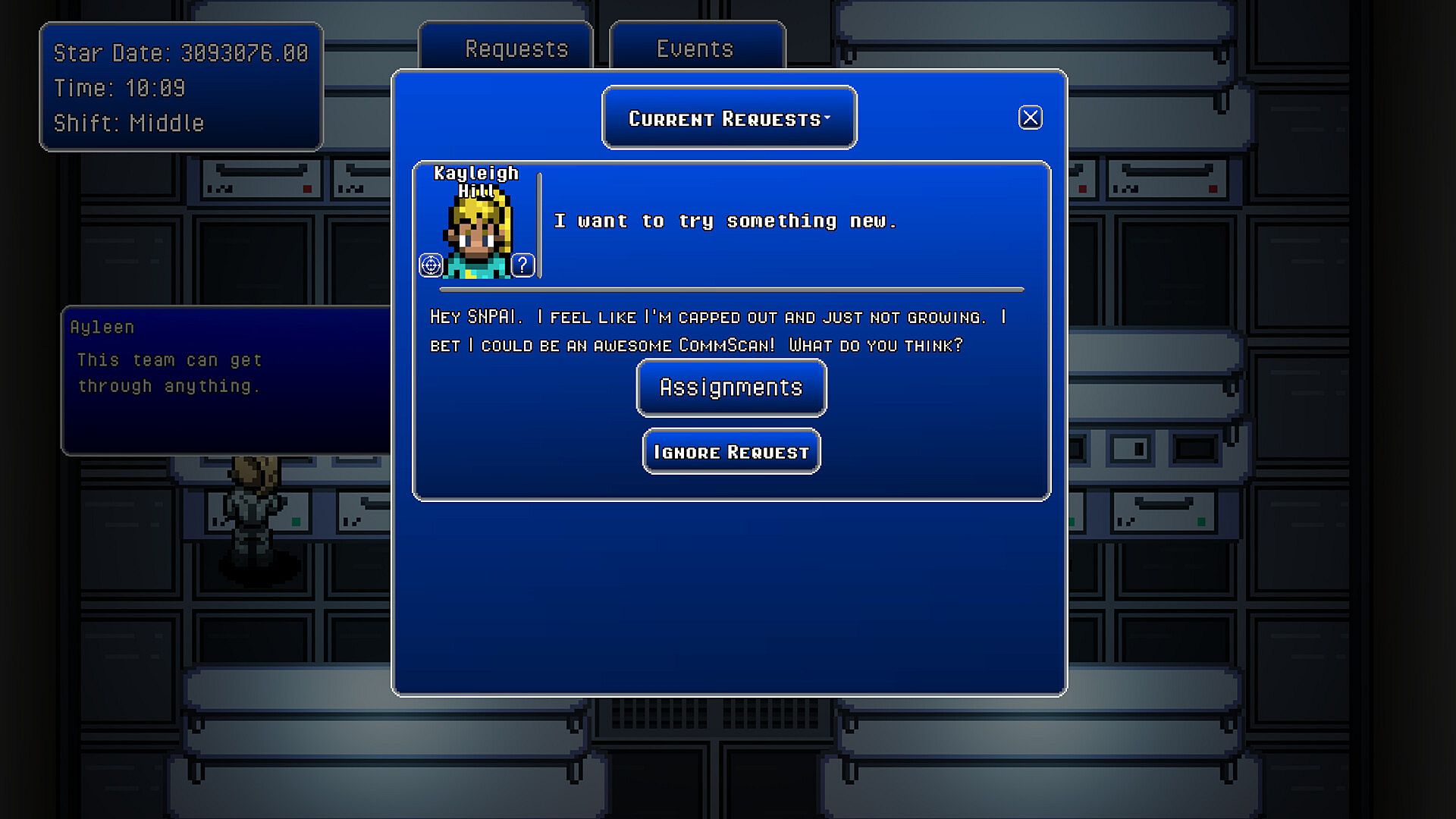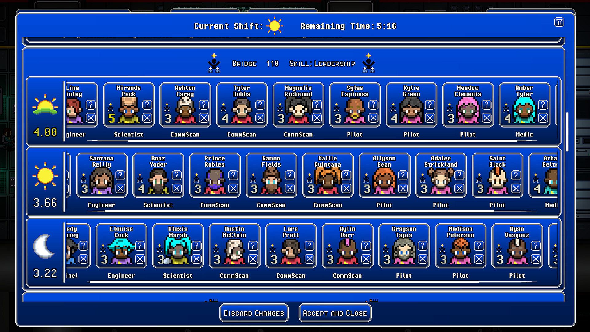 A large part of your responsibilities will be to manage the crew's performance. Some crew members will have hidden talents that will suit them for a new role. Others may be complete novices at a particular job but have a high potential for growth if you let them build experience. You will have to balance what assignments are optimal now, versus which could unlock advantages over time.