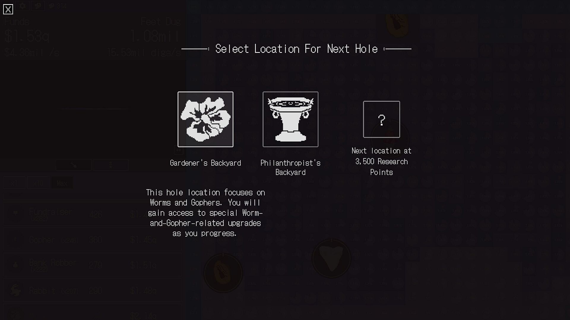 Surprisingly, all of your neighbors are really excited about your hole-digging operation. Some of them have even offered up their backyard as a location for you to dig your hole! You'll be able to choose from multiple different backyard locations each time you start digging a new hole. Each location has a unique set of upgrades that provide different play styles across prestiges.