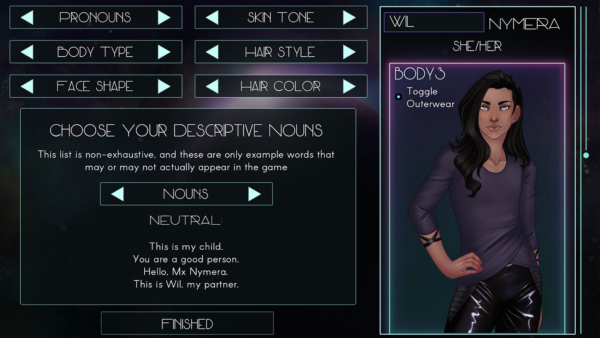 • WSC comes with a small character creator, allowing you to pick some of your MC's physical characteristics, including hair colour and style, skin colour, and pronouns.