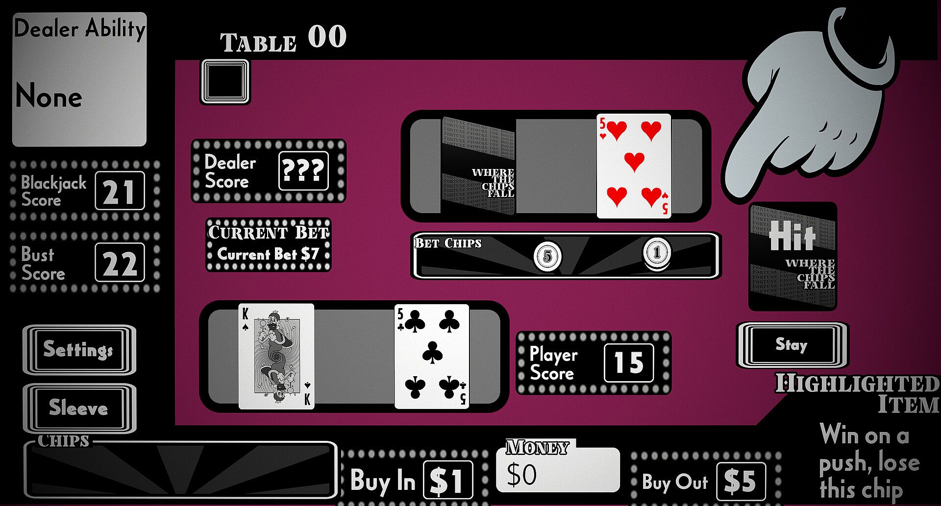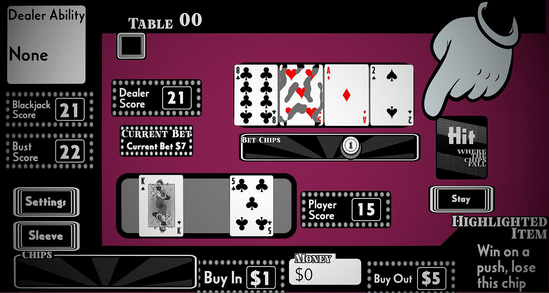 Use your chips to outwit the dealers at this devious casino in a game of blackjack. Win side bets for powerful boons and Buy new packs in between each table to find better chips and put the odds in your favor. Or you can cheat with cards up your sleeve, stacking the deck, and more. Watch out though, the dealers have tricks of their own. Claim their chips to gain their abilities and go all the way to the top!