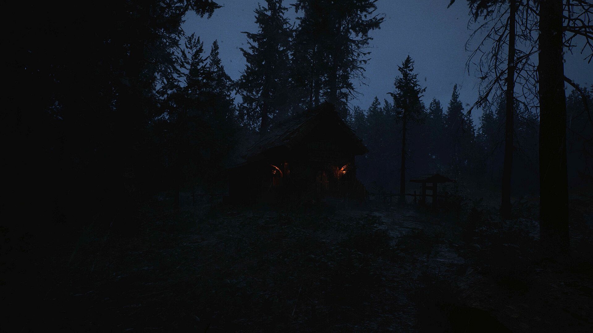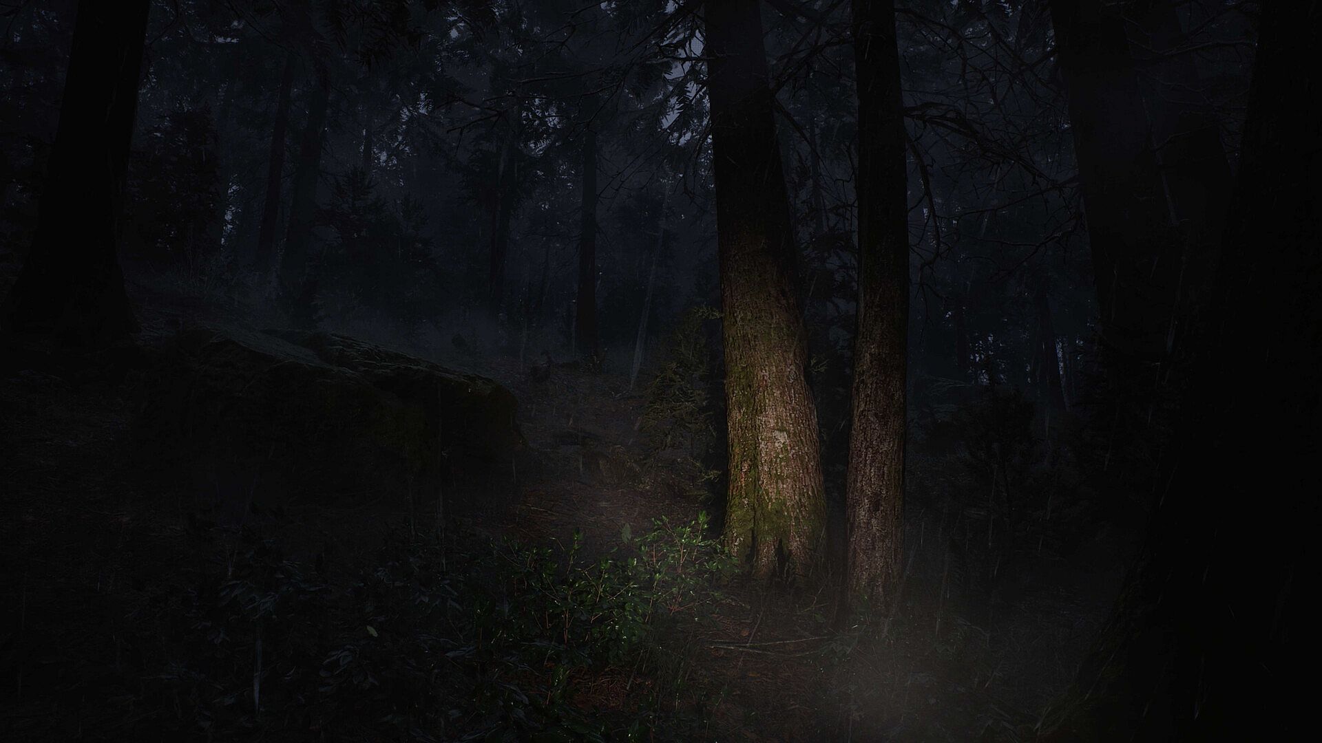 From the moment players awaken in the rain soaked forest, the world feels heavy and uncertain. Light is scarce, filtered through clouds and mist, with only a flashlight to push back the darkness. Shadows stretch unnaturally. Hidden figures blend into the trees. Distant lights beacon but not always to safety.