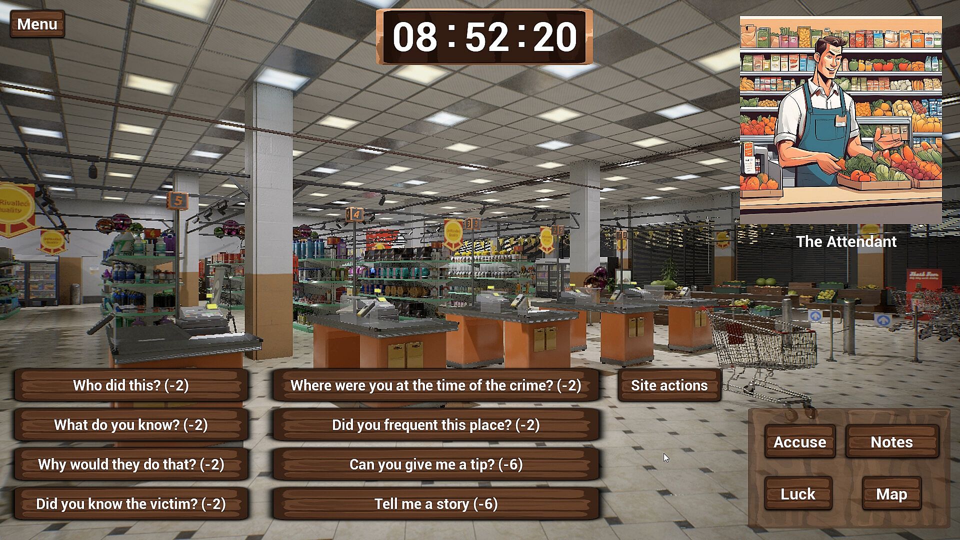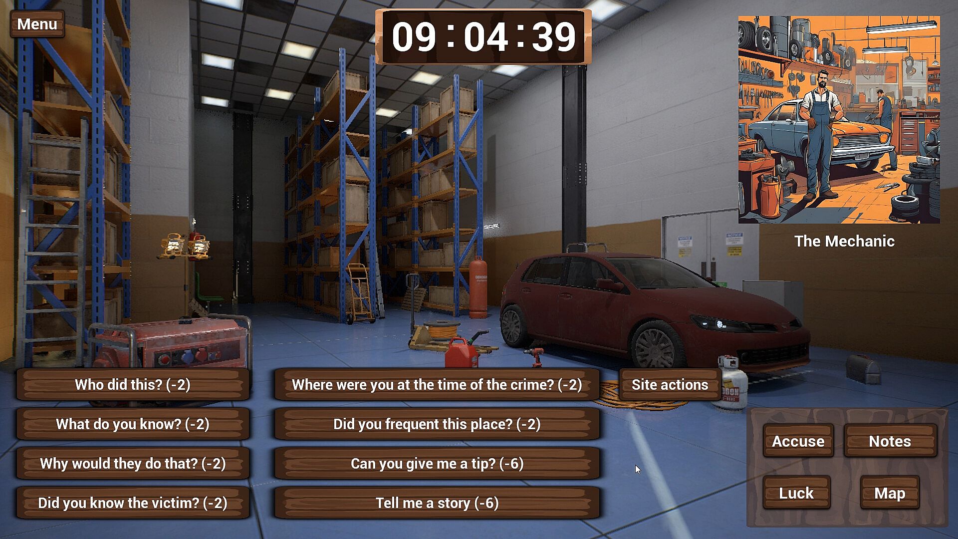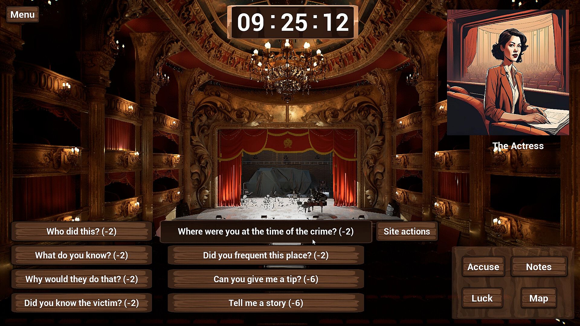 In the game, you will have a map with several places to visit and in each place a character to interrogate. In each location, you can also investigate the scene by opening drawers, looking at surveillance cameras and even looking at the crime scene. Of course, each action you take will cost you time and the clock tells you how much time you have to find out who planned the crime. The more information you collect, the better, but the less time you will have in the future, so create your strategy, read the clues carefully and good luck! And most importantly, have fun!