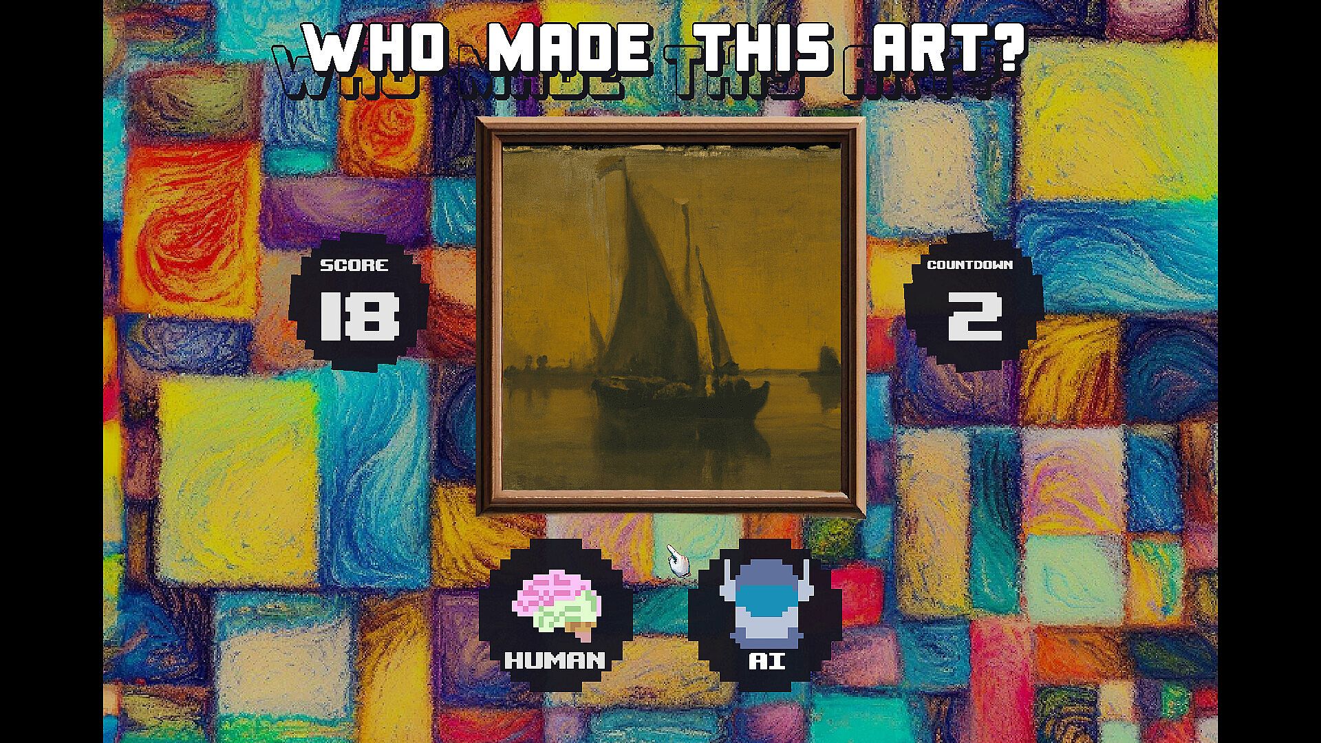 With simple but addictive gameplay, in this quiz game you will have less and less time to guess if a artwork was made by an artificial intelligence or by a human, be quick!