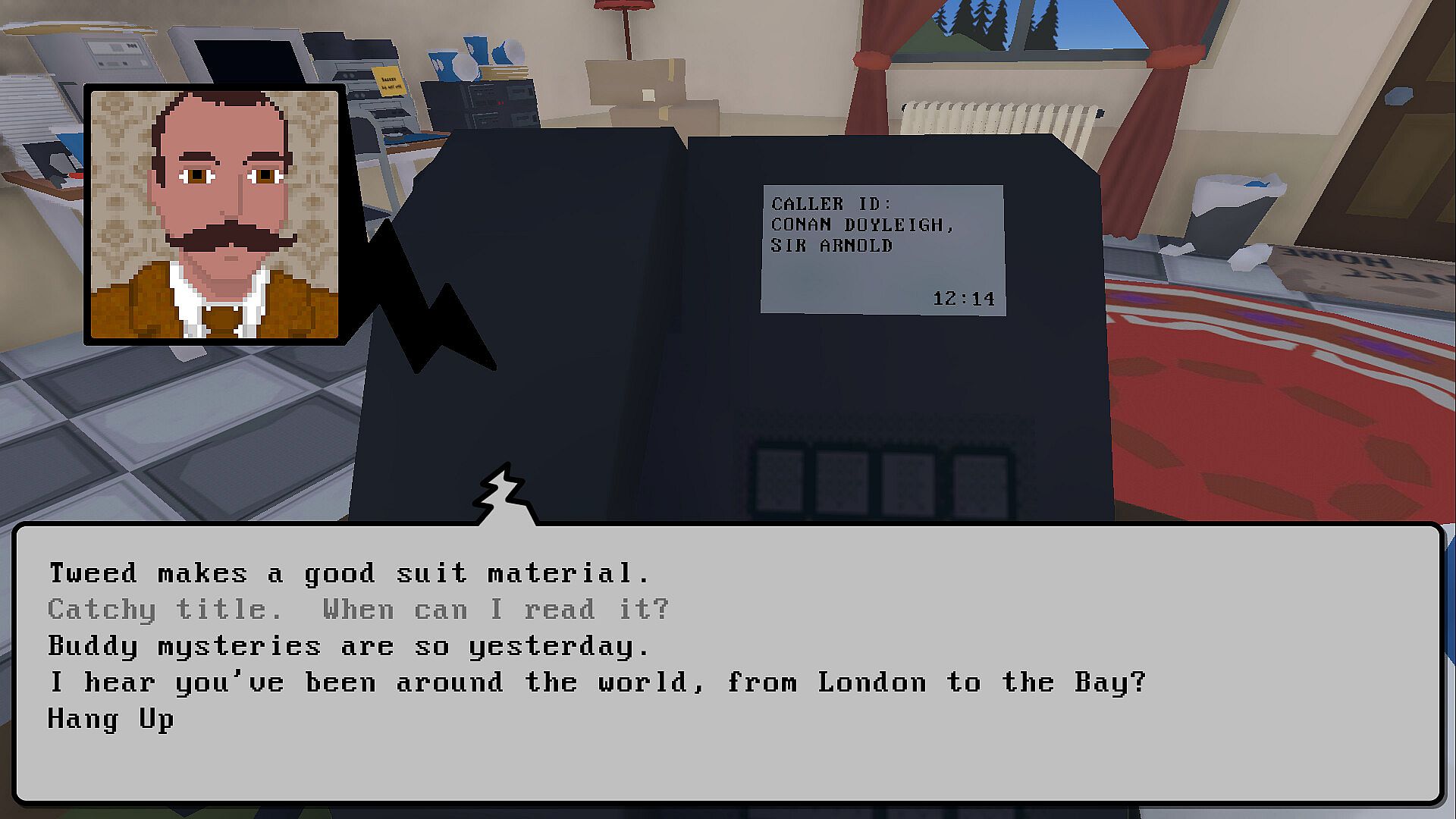 Five mystery authors have gathered at the Gargoyle Hotel... and one of them has ill intent! Discover the would-be murderer before the clock strikes midnight in this retro-style puzzle/strategy game; record conversations via your super-high-tech surveillance setup (or simply eavesdrop), search for clues in the suspects rooms, or tease information out of them via targeted interrogation over the phone. Once you have the suspect, victim, murder weapon, room, and motive, a single phone call is all it takes to unravel their entire nefarious scheme.