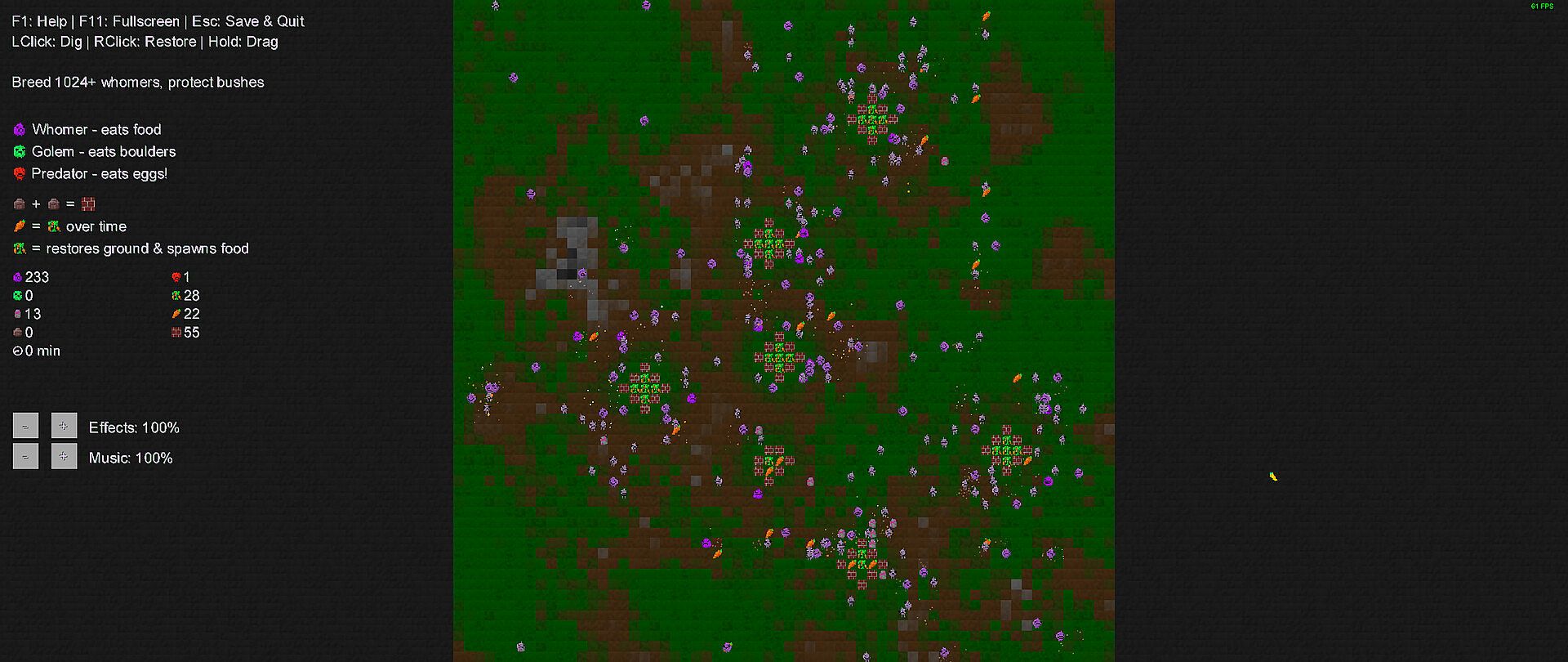 A small window into a simple ecosystem. Watch as Whomers dig through layers of terrain, find food, and interact with their environment in this stripped-down simulation game.
