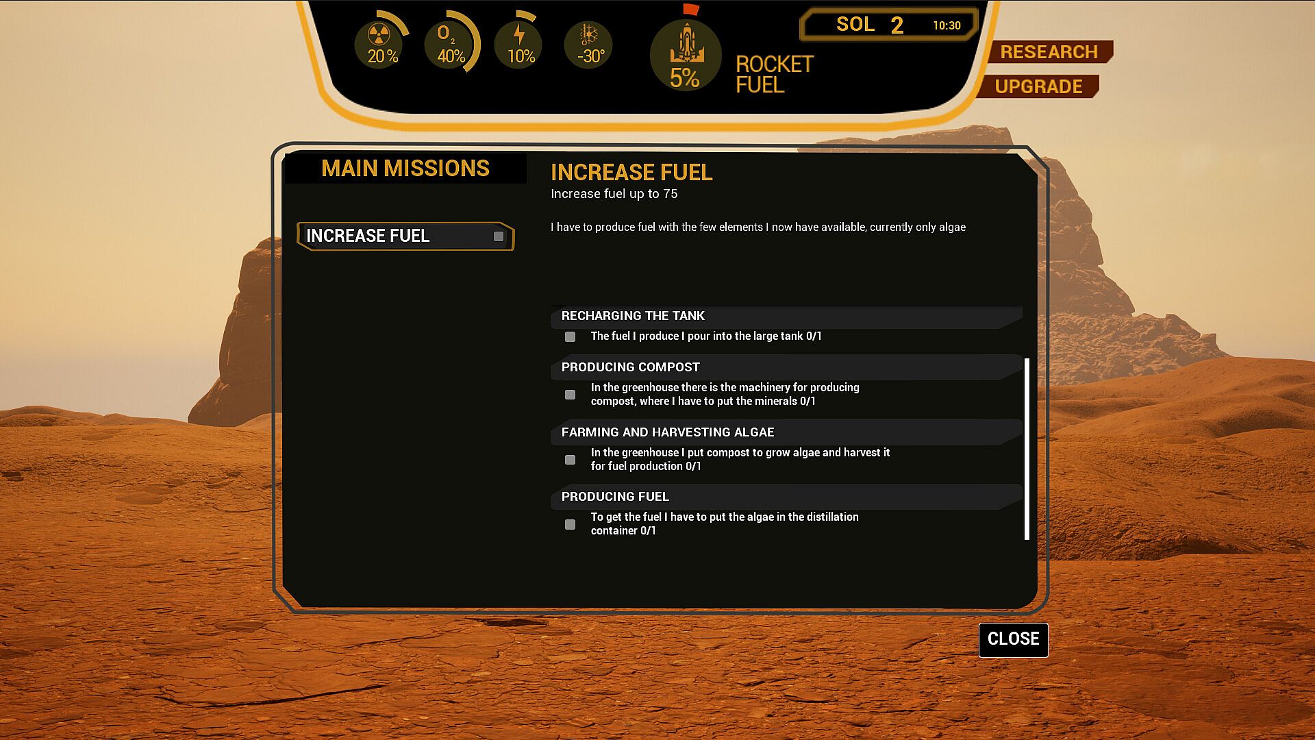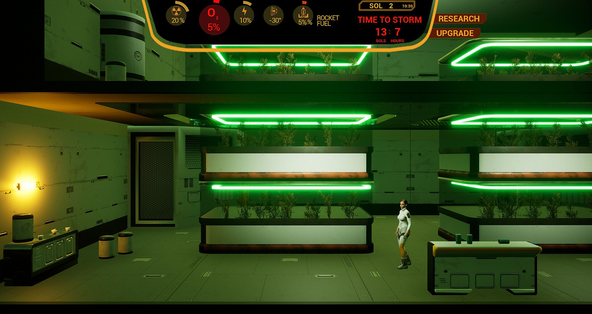 A Mars survival management simulator in which you must produce fuel from bacteria and algae to leave Mars before an incoming storm destroys your base. Defend your base from the bacteria that infest it. Manage the fuel that also powers your base's elevator and your machinery. Make crucial decisions to survive.