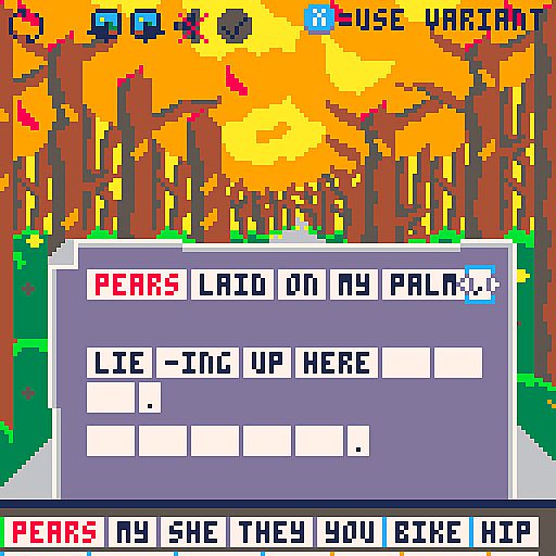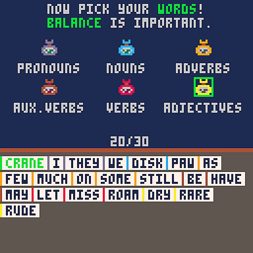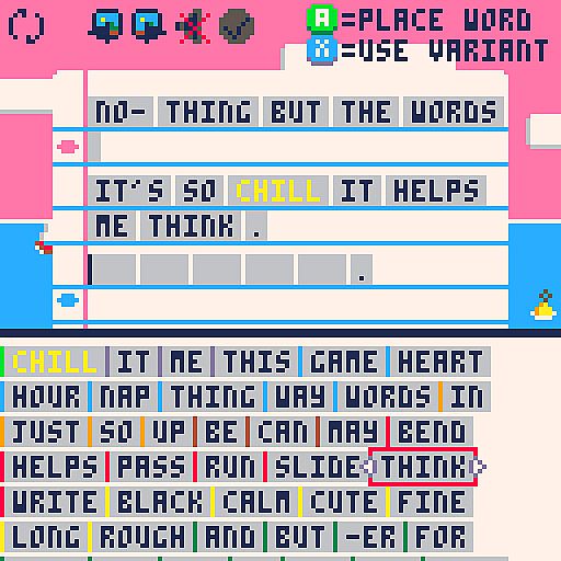 • Asynchronous multiplayer-ish! "Shared Game" mode allows players to compose with the same word set using a clever password system. Get together, play and compare your works, or play by yourself, send your friends a poem and wait for theirs!