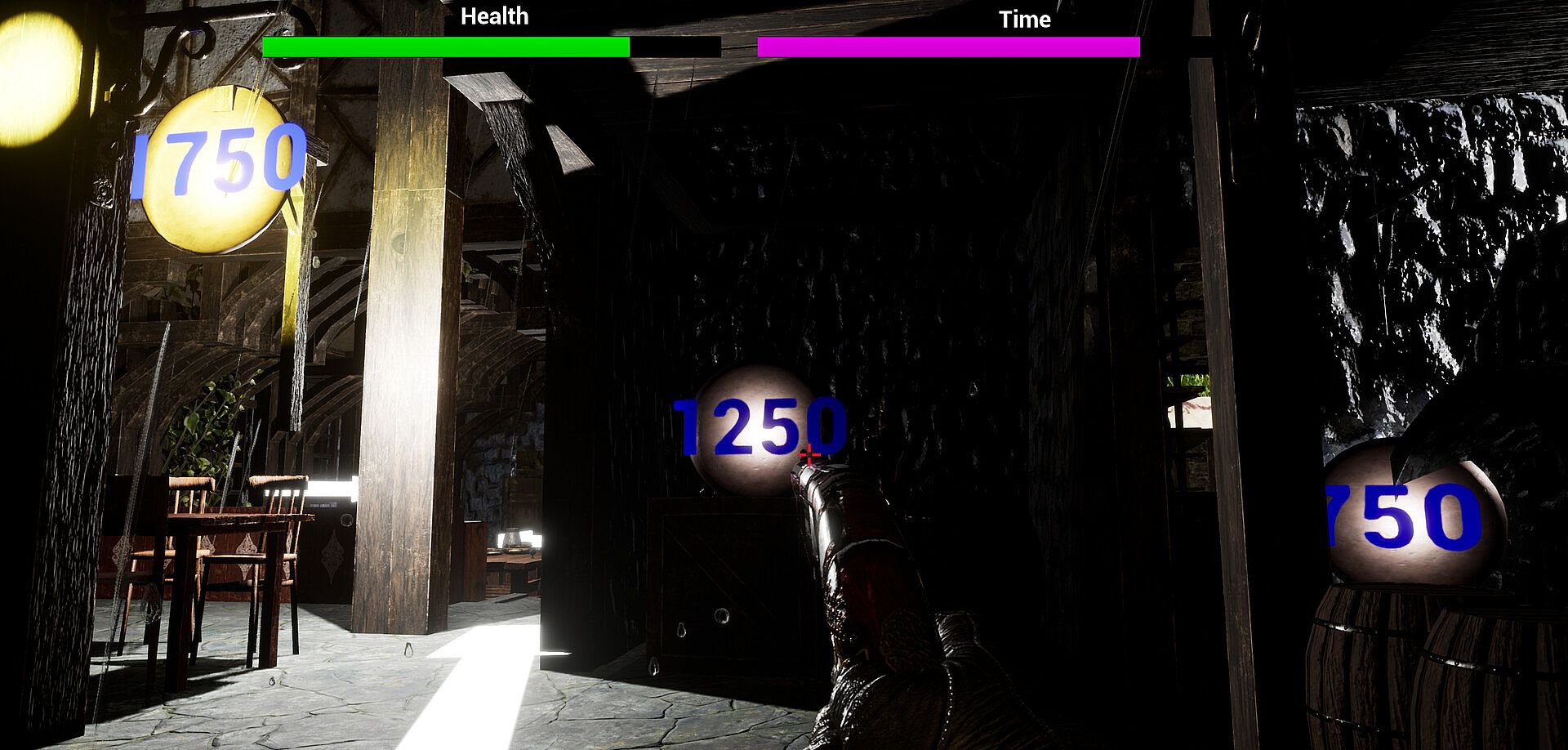 William is a shooter who lived in the Middle Ages. He will leave a cell located in the center of the castle and go to the target area located in a forest area outside the castle. However, the roads he can use to go to the target area are surrounded by fences. There is no way to go outside the fences. For these reasons, he has to pass through houses and taverns. He also has to pass through large water channels located inside and outside the castle. William must not touch the water. When he touches it, he will lose all his life and the game will end. William will use vertical moving platforms to overcome the high walls of the castle and horizontal moving platforms to cross the water channels. However, William has 100 points of life at the beginning and 100 seconds to go to the target area. He loses 10 points of his life every time he touches an explosive. For this reason, William must constantly hit the target numbers that will appear in front of him and collect points and earn extra life and time. William will gain 10 lives and 3 seconds of time for every 1000 points he collects.6 levels must be completed before he can go from the cell to the target area. These levels are subject to sunny, rainy and snowy weather. One level is completed at night