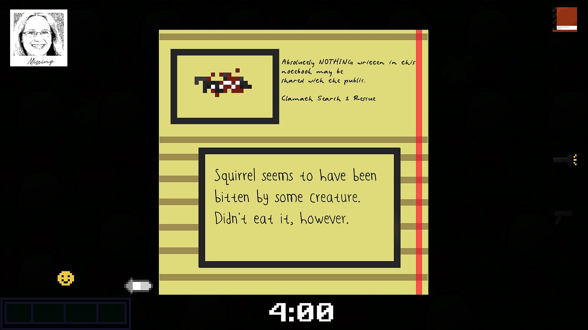 There is an abundance of creatures in these woods, some out to get you, some not. Be careful not to make too much noise and keep yourself sane. You are provided with a logbook to help you retrace where the victim could have gone. You have until 6AM to find them, if you make it out alive. Keep an ear out for any breathing, if the missing victim is alive, that is. That's it, good luck and thank you for your loyalty to Clamath Search & Rescue!