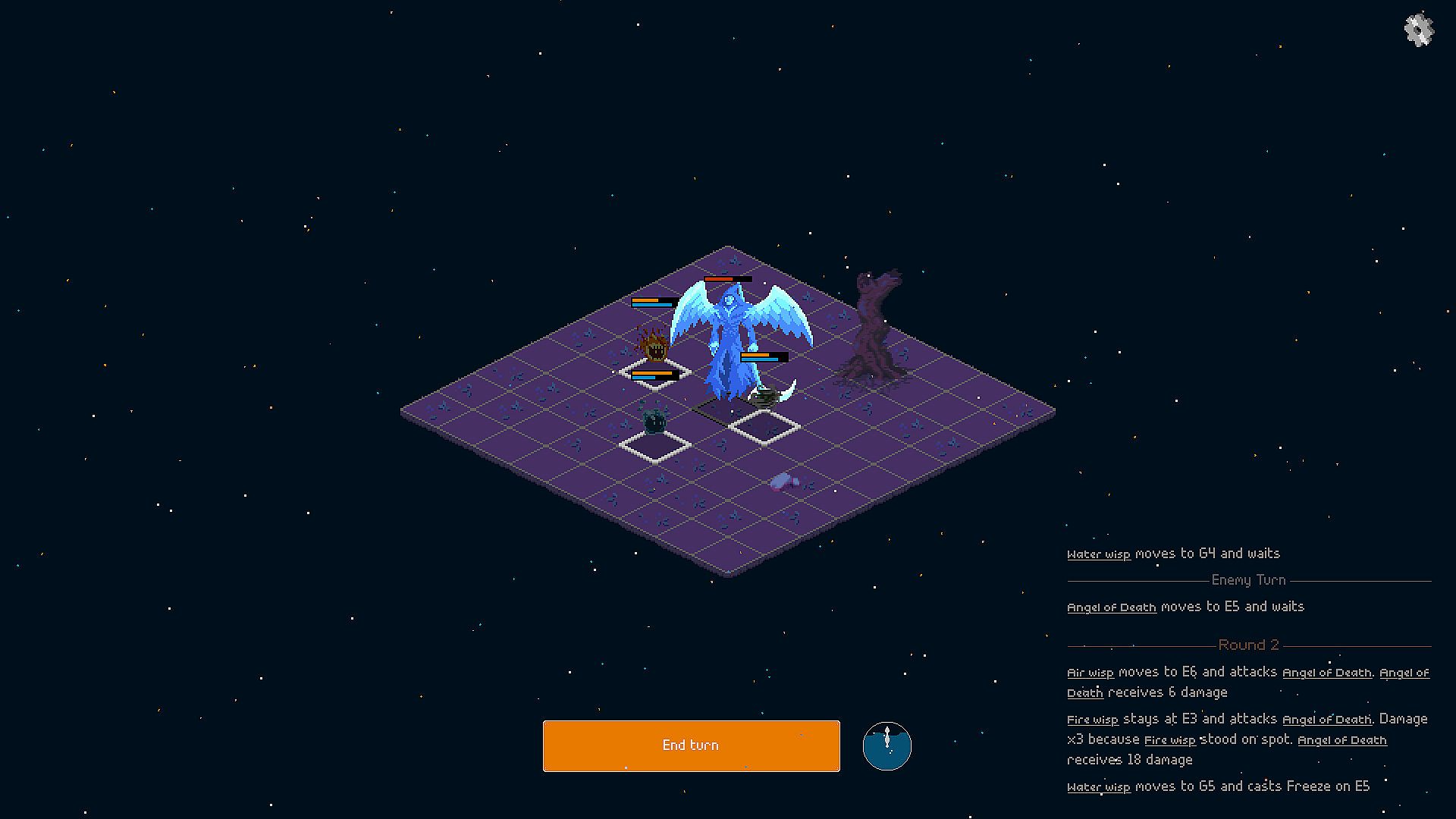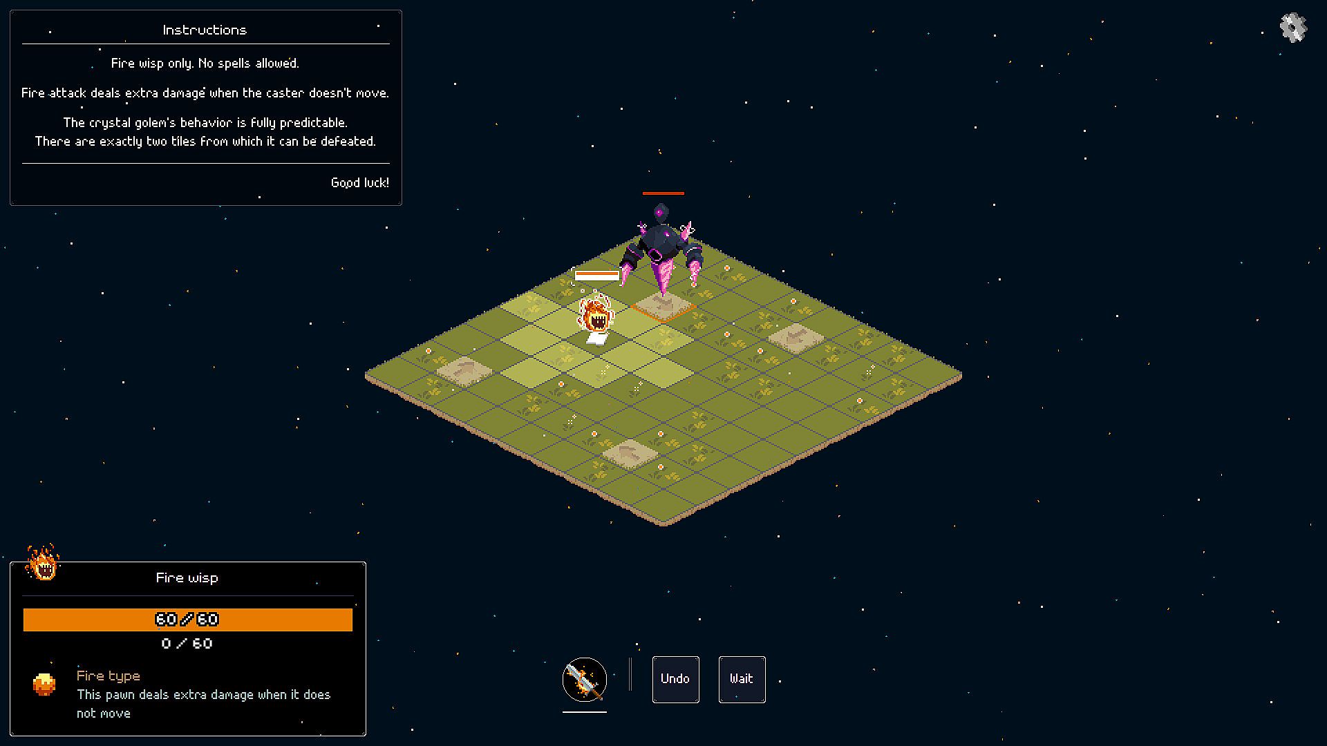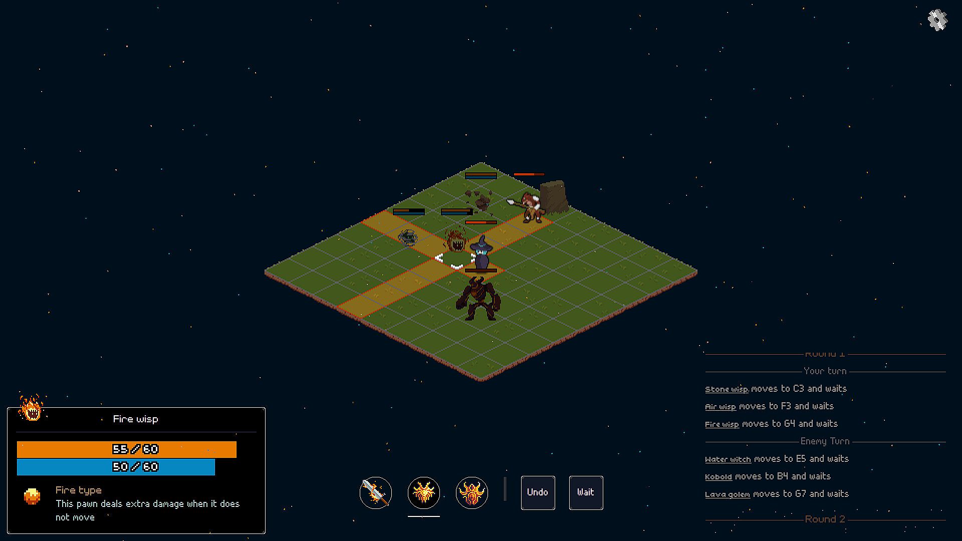Wisps of the Elements is a grid-based rogue-lite. Each element has a special effect: Fire and Stone aim at controlling the board, while Air and Water get bonuses and penalties depending on the tide cycle.