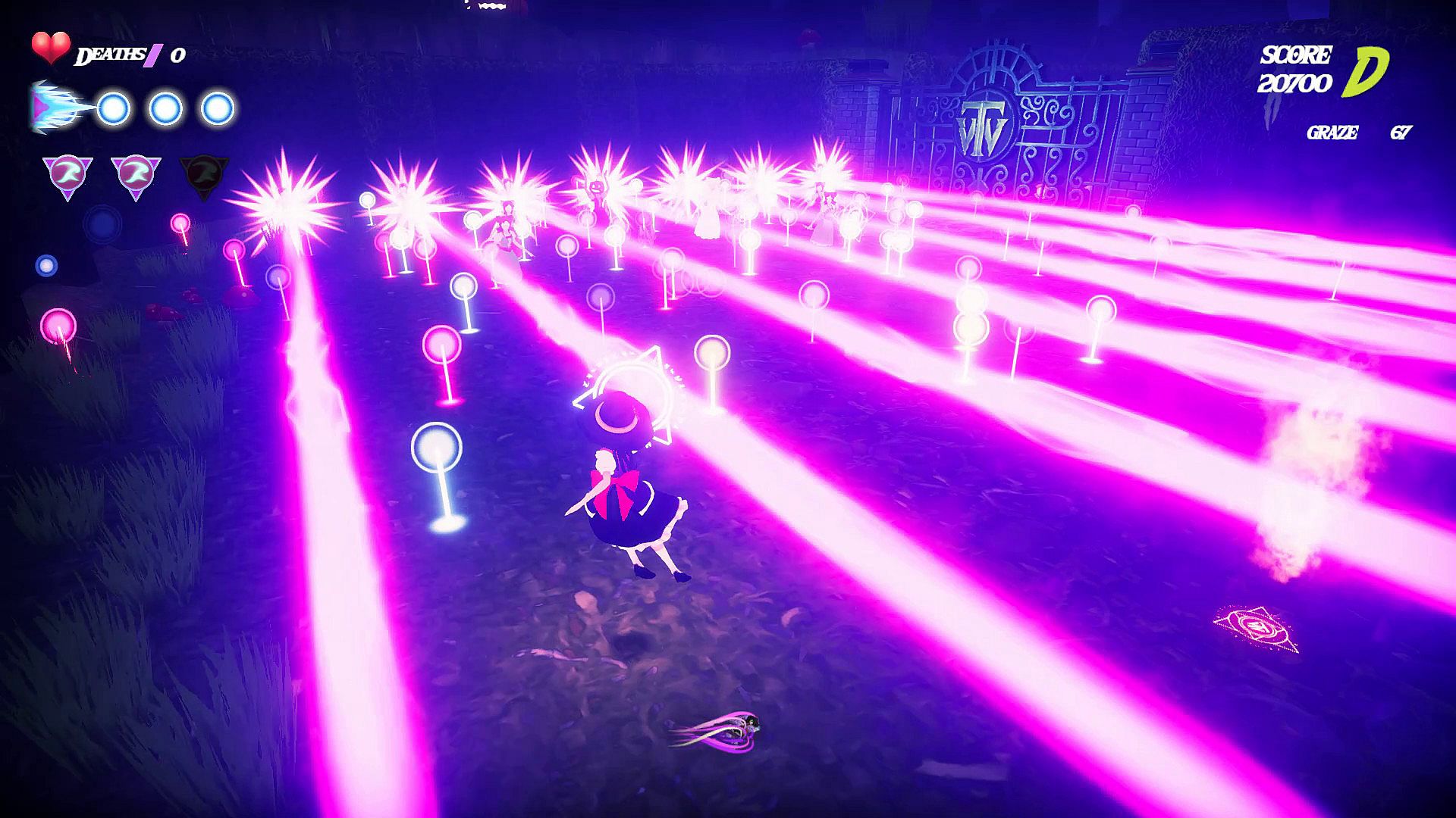 Dodge duck and weave through terrifyingly intricate patterns of magical projectiles as you seek the greatest treasure of all. The Ancient and powerful Grimoire!