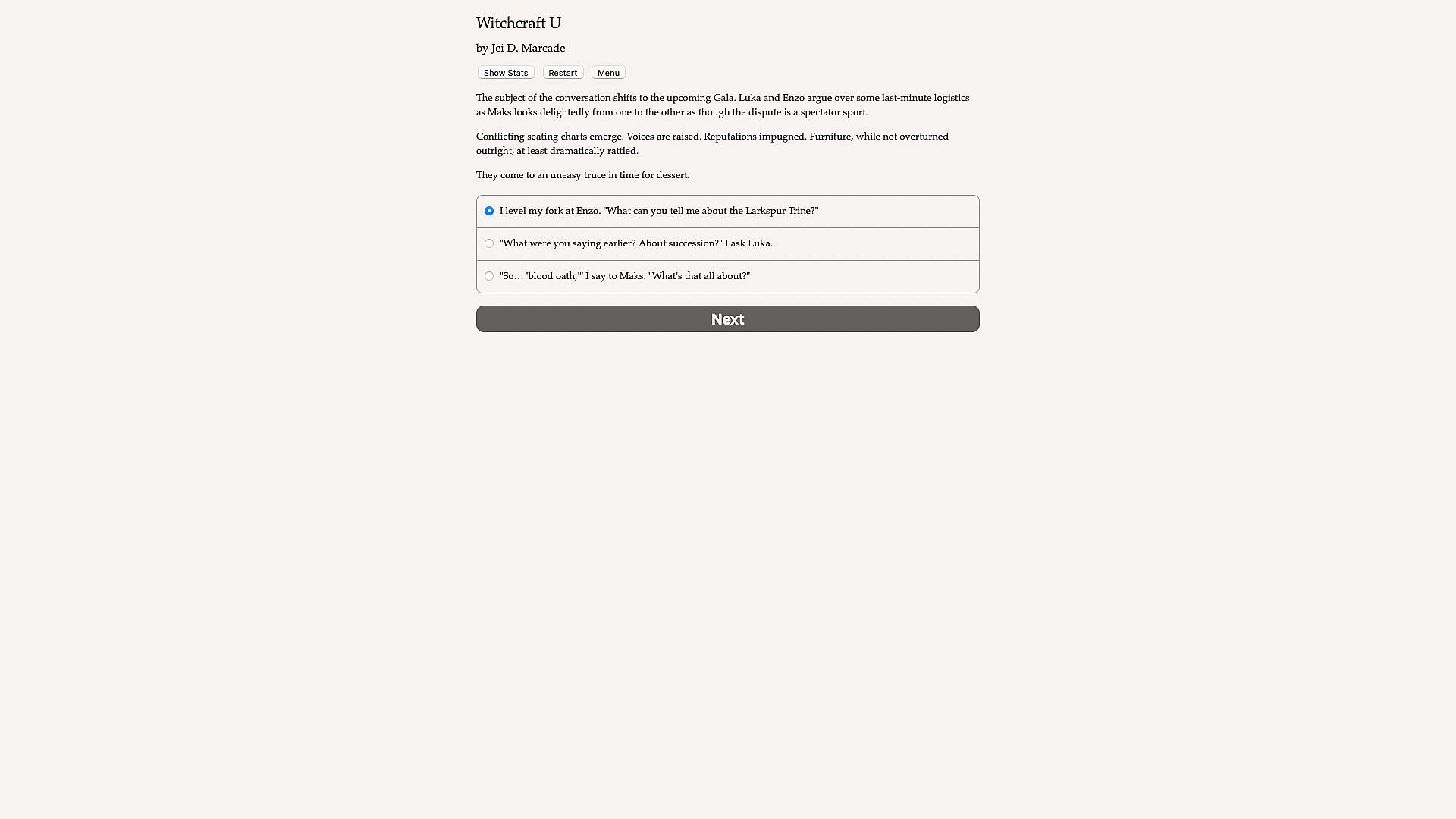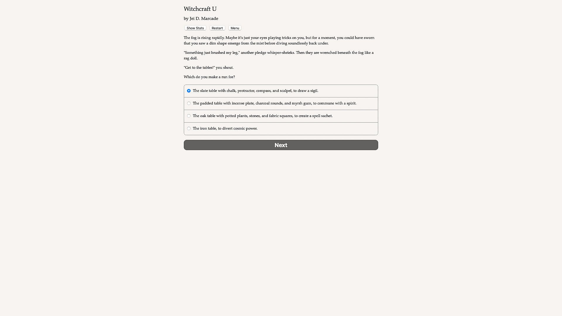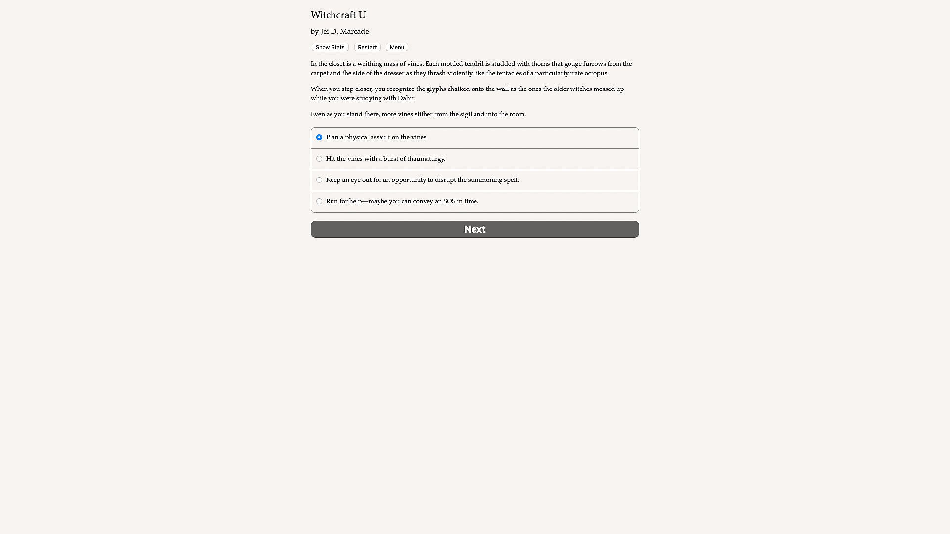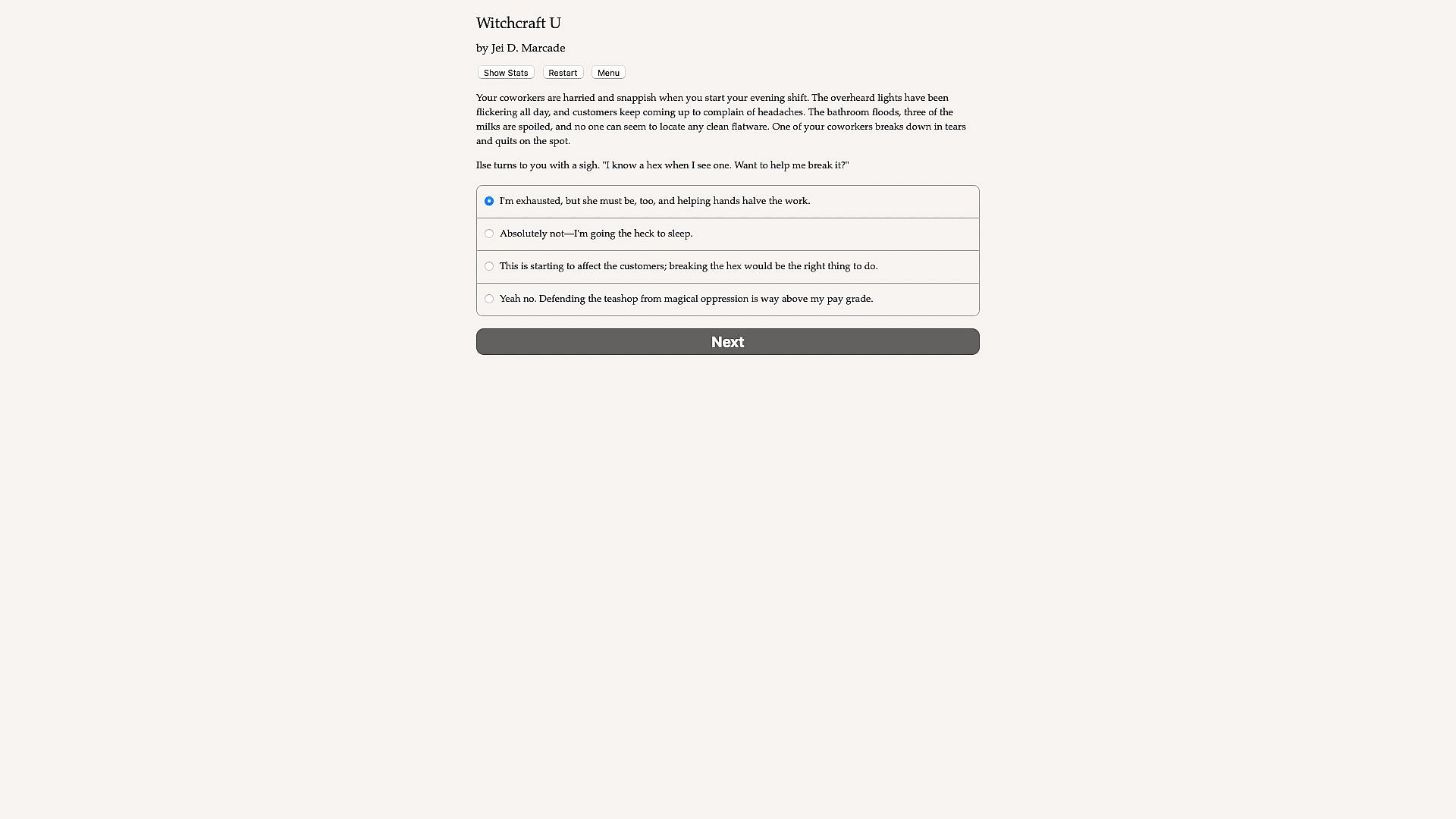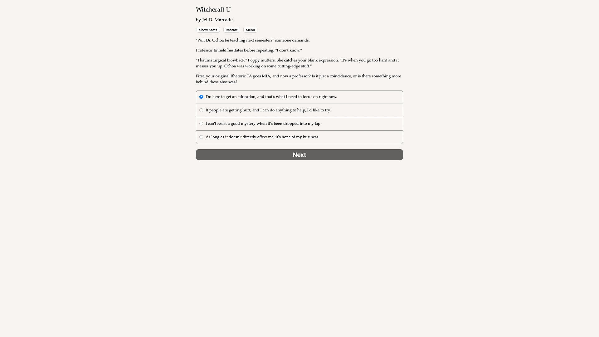 Witchcraft U is a 200,000-word interactive fantasy novel by Jei D. Marcade. It's entirely text-based, without graphics or sound effects, and fueled by the vast, unstoppable power of your imagination.