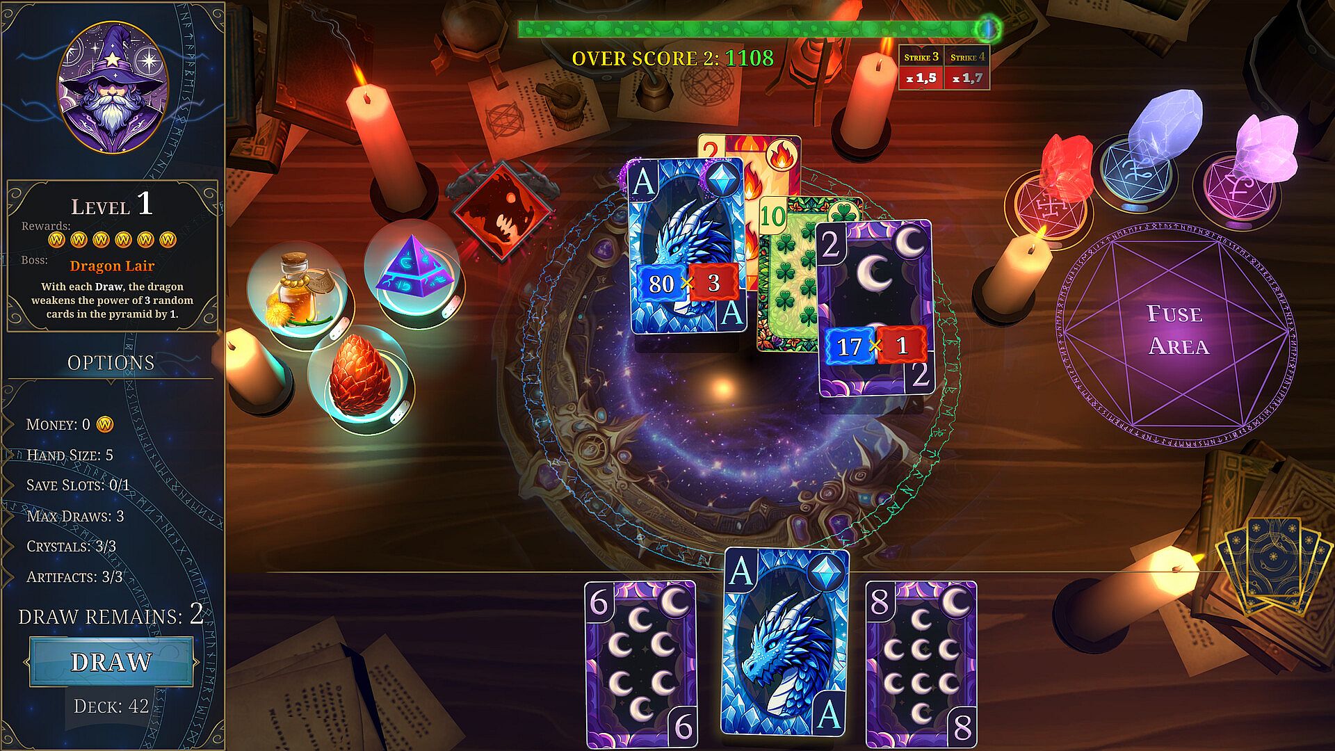 The more similar the cards are to each other, the more initial points the player will receive for the combo. Then use all your magical tools to get as many points as you can for the combo you're playing! And don't hold back - the bonuses increase with each combination in a row.