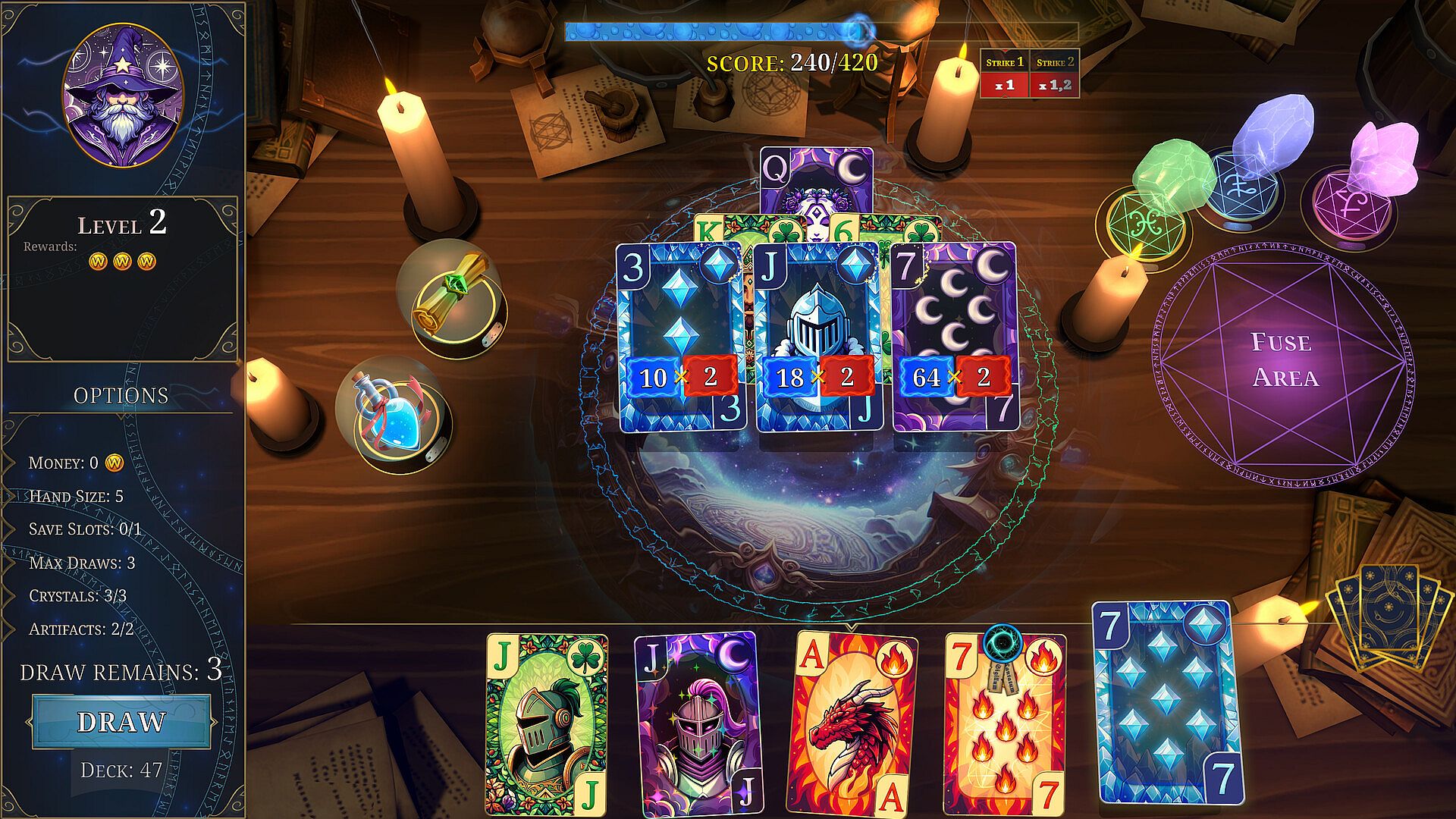 Wizard Hand is a magical solitaire roguelike about accumulating the maximum number of magical points by mastering the art of combining enchanted cards, transformations, and a collection of magical items.