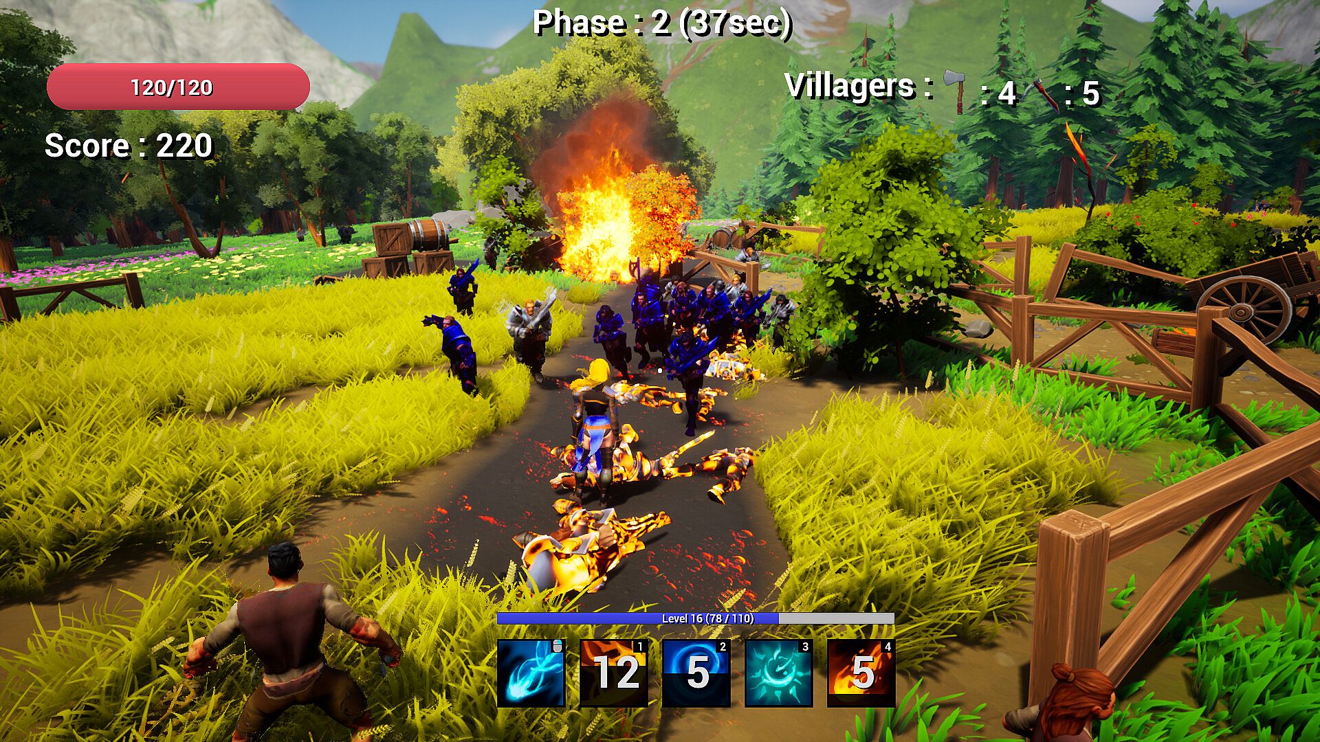 Defend successfully the different parts of the village (the lumbermill, the farm, the town and the magic ruins) and defeat the evil boss to claim your victory.