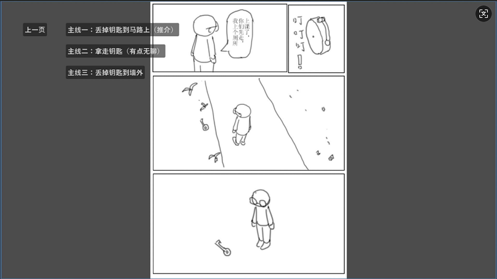 The game can lead to different storylines and endings through choices. Due to my poor drawing skills and programming abilities, I didn't complete it very well, but the main plot can still be understood. This is a comic game, mainly allowing players to experience different storylines through choices. If this game mode can make some money, I will consider making it longer and better in the future. My drawing skills are not good enough for now, but I will keep improving. Players can reach different endings by choosing different buttons. Wow, it's really hard to write this. I have to write 200 words, and I've been rambling but still haven't reached that number. The first plot is the one I'm more satisfied with because it's a funny one. This one is relatively more bearable. To be honest, I'm too embarrassed to show the other two, but there's no way around it. In the future, I plan to release a game with a branch for choosing a wife, like "Five Weddings".